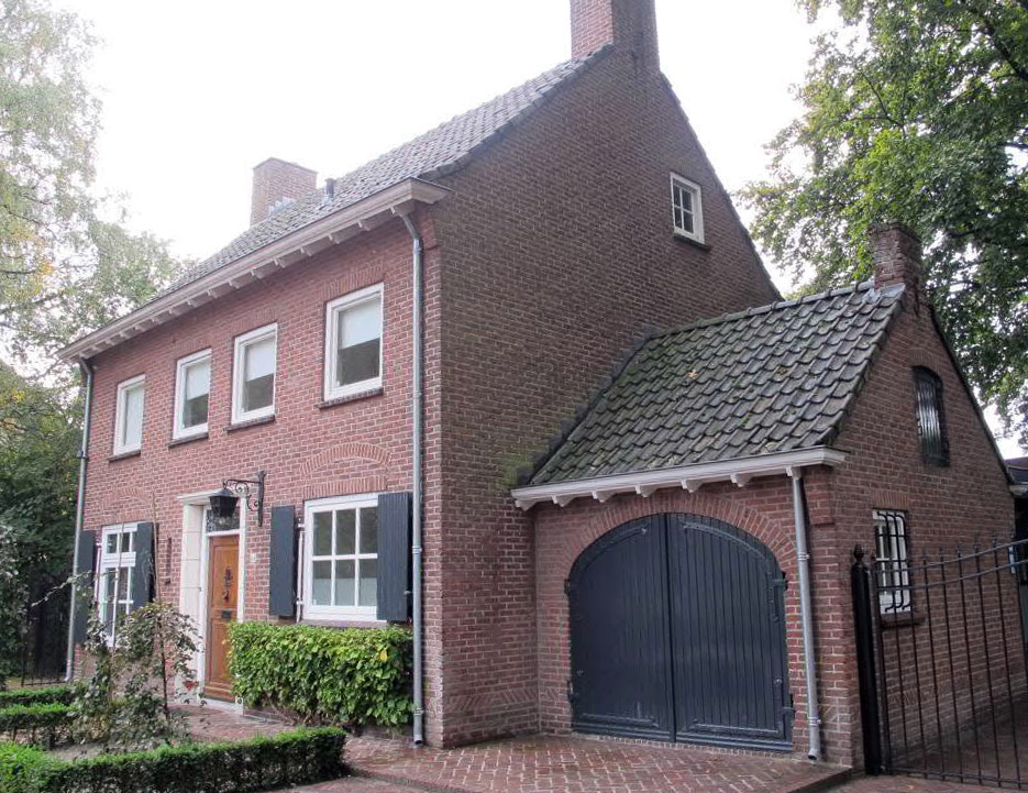 Zijgevels:De zijgevels zijn uitgevoerd als tuitgevel (het metselwerk van de gevel gaat over in het metselwerk van de op de nok geplaatste schoorsteen), met rechts en links uitkragend metselwerk onder de goot.Tegen de rechter zijgevel van de woning is de voormalige garage uitgevoerd (nu woonruimte). Behoudens een klein venster met 4-ruits raam ter plaatse van de zolder is deze zijgevel van de woning verder geheel blind uitgevoerd. De voormalige garage bevat aan de voorzijde een grote toegang (voormalige garagedeuren) met houten strokendeuren met smeedijzeren details. Het zijgeveltje van dit kleine volume is uitgevoerd als tuitgevel en voorzien van een venster met 4-ruits raam op de begane grond en een getoogde opening met houten luik ter hoogte van de zolder. Net als bij de zijgevels van de woning is ook deze zijgevel voorzien van uitkragend metselwerk onder de goot. In de achtergevel van de voormalige garage bevinden zich twee toegangen, waarvan de rechter een toevoeging is uit 2010. Op dit deel van de (voormalige) garage en de achtergevel van de woning sluit de in 2010 gerealiseerde nieuwbouw van het saunacomplex aan. De linker zijgevel bevat links op de begane grond een groot venster met enkel raam en 3-delig bovenlicht. Net als in de voorgevel is dit venster aan de bovenzijde voorzien van een rollaag met daarboven een ontlastingsboog in het metselwerk. Hierboven op de verdieping twee vensters gelijk aan de verdiepingsvensters in de voorgevel. Ter plaatse van de zolder twee vensters met 4-ruits raam. Ook boven deze vensters is een strek uitgevoerd. Achtergevel:De achtergevel bevat rechts op de begane grond een brede ingang met vernieuwde houten openslaande deuren met ruit en enkelruits bovenlicht. Rechts hiervan in de gevel een gevelsteen met in reliëf (en profil) | 4 |