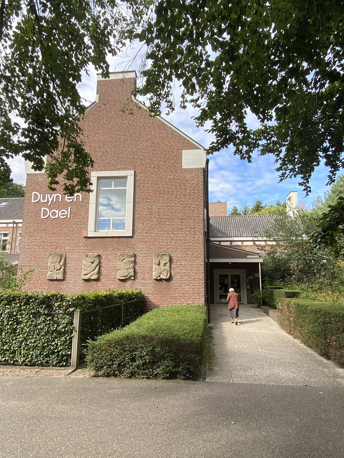 Bezinningscentrum (G)Algemeen (hoofdvorm, kap):Dit samengestelde bouwdeel werd in 1962 naar ontwerp van Jos Schijvens aan het complex toegevoegd als bezinningscentrum.Het twee bouwlagen tellende bouwdeel heeft een kruisvormige opzet, waarbij de zuidzijde van de langere noord-zuid georiënteerde vleugel met een verbindingslid aansluit op de noordgevel van de achtervleugel. De vleugels hebben met gesmoorde opnieuw verbeterde holle pannen gedekte zadeldaken, die boven vier kopgevels eindigen tegen een tuitgevel. De op het zuiden- en westen gerichte dakvlakken hebben een reeks oorspronkelijke dakkapellen met platte daken en met leien beklede zijwangen. Alle dakkapellen hebben in aluminium vernieuwde ramen. De op het oosten en noorden gerichte dakvlakken hebben een reeks dakramen, waarvan het merendeel tot de oorspronkelijke opzet behoort. Alleen aan de westzijde van het noordelijke dakvlak zijn recente dakramen aanwezig. Aan de noordzijde van de noord-zuid georiënteerde vleugel bevindt zich de kapel, waarvan de kap iets lager ligt. Deze kapel wordt aan de oostzijde geflankeerd door een L-vormige zijbeuk onder een met gesmoorde opnieuw verbeterde holle pannen gedekt lessenaardak. Tegen de noordgevel van de kapel bevindt zich centraal een halfronde absis onder een met gefelst koper gedekt koepeldak. Bij de noordelijke topgevel van de kapel is de ‘tuit’ aanzienlijk forser uitgevoerd dan bij de overige gevels en voorzien van een vierkante opening als (symbolische) klokkenstoel. Bij de zuidwestelijke binnenhoek loopt over de gehele lengte van beide gevels een forse betonnen luifel, die tot de oorspronkelijke opzet van dit bouwdeel behoort, evenals de middels een gemetselde keermuur afgescheiden laag bordes onder deze luifel. Tegen het middendeel van de oostgevel van de zuidelijke vleugel bevindt zich een uit 1989 daterende enkellaags aanbouw onder een met gesmoorde opnieuw verbeterde holle pannen gedekt lessenaardak. In de noordwestelijke binnenhoek bevinden zich een lifttoren en een samengesteld enkellaags bouwdeel onder een platdak. Deze delen zijn vanaf 1981 tot stand gekomen en door sloopwerkzaamheden in 2012 ten opzichte van de eerdere omvang weer wat verkleind. Gevels:De vensters hebben bakstenen lekdorpels en halfsteens rollagen. Met uitzondering van de kopgevels en de kapelgevels hebben alle gevels een regelmatige reeks rechthoekige vensters met in aluminium vernieuwde vullingen. Enkele vensters hebben een iets verdiept gelegen dichtzetting. Bij de onder de luifel gesitueerde openingen van de zuid- en westgevel betreft het dubbele deuropeningen. Ter hoogte van de begane grond zijn in het gevelvlak vier in tufsteen uitgevoerde sculpturen, verbeeldende ‘De Schepping’, opgenomen.De oostelijke kopgevel heeft op de verdieping in het midden een fors rechthoekig venster met een betonnen omlijsting. De westelijke kopgevel heeft op de verdieping en tweede verdieping in het midden een deuropening, met aansluitend een betonnen balkon en een oorspronkelijke ijzeren brandtrap. De zuidelijke kopgevel heeft boven het platdak van het tweelaags verbindingslid een fors rondvenster. Alle openingen in deze kopgevels hebben eveneens in aluminium vernieuwde vullingen. De gevels van de kapel hebben dezelfde hoofdopzet als de vleugelgevels. De oostgevel valt echter grotendeels binnen de L-vormige zijbeuk. Deze zijbeuk heeft het linker deel van de oostgevel een dubbele deuropening met vernieuwde aluminium vulling binnen een kunststenen omlijsting. De luifel boven deze opening is niet oorspronkelijk. Het terug liggende rechter deel van deze gevel heeft twee vensters met aluminium ramen. De westgevel van de kapel valt deels binnen de jongere enkellaags bebouwing. Deze gevel heeft geheel links een over de volledige gevelhoogte lopend venster met glas-in-beton, versterkt met twee verticale ijzeren profielen. De gebogen, gesloten gevel van de absis sluit aan beide uiteinden op de noordgevel van de kapel aan met een smal hoog venster met een oorspronkelijk stalen raam met figuratief glas-in-lood. | 23 |