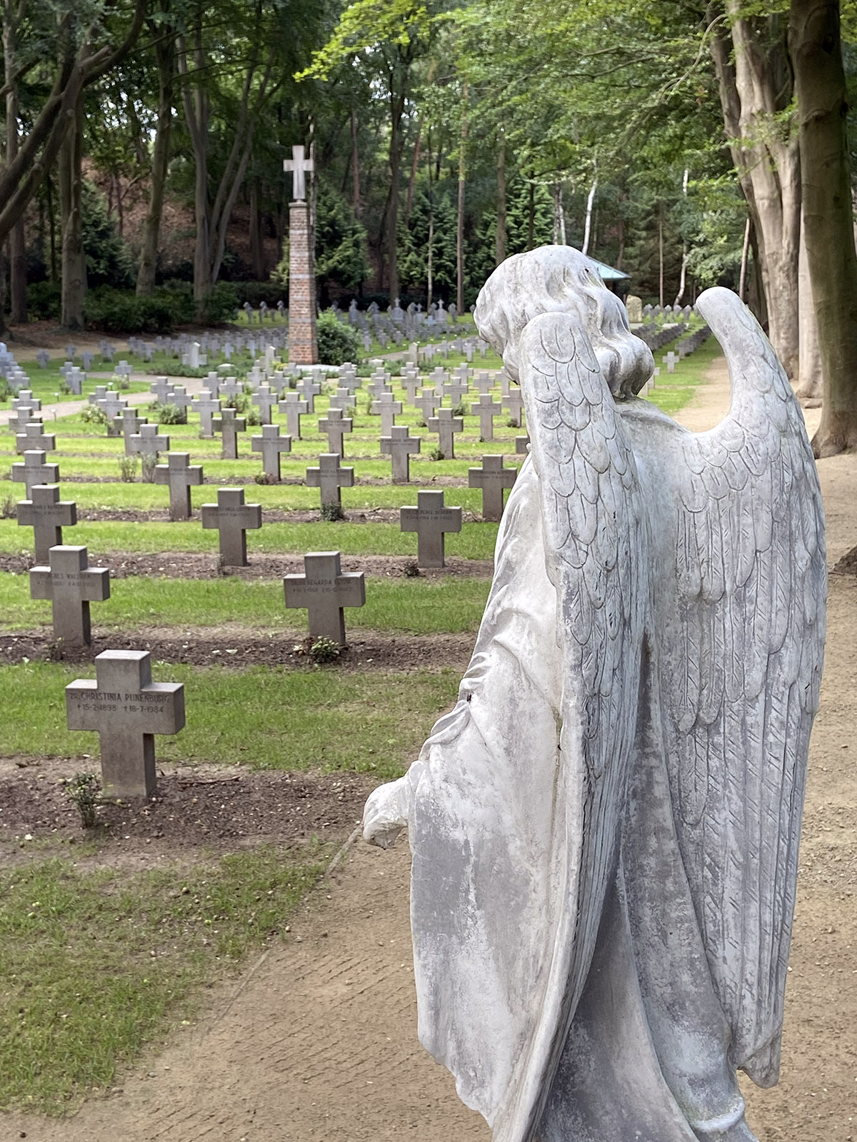 Vanaf het toegangshek voert een met betontegels bestraat pad in westelijke richting. Op de westelijke helft van de begraafplaats eindigt het pad voor een sober kruis op een hoge sokkel. Dit punt vorm het centrum van de halfronde vorm die de structuur vormt voor het westelijke deel. Langs de oostzijde van het kruis loopt een pad in noord-zuidelijke richting over de begraafplaats. De diverse graven zijn uniform uitgevoerd met kleine hardstenen kruisen die in doorlopende, haaks op de paden gesitueerde, perken zijn geplaatst. Tussen de perken liggen gazonstroken. Tegenover het toegangshek tot de begraafplaats is (buiten de begraafplaats) een vrij recente gedenkplaats ingericht. Even ten zuiden van deze gedenkplaats (N) is tegen de zuidelijke uitloper van het sikkelduin een verhoogd terras met een Mariabeeld voor een in ruwe natuursteenblokken opgebouwde muur met ondiepe beeldnis (O). Voor het terras ligt een betonnen trap, waarnaast twee bidstoelen zijn geplaatst. Tegen de zuidhoek van de begraafplaats is nog een zandstenen beeld van de Heilige Vincentius. Ten zuiden van de begraafplaats en langs de westzijde van het terrein ligt een vrij forse heuvel, die zich ten noorden van het terrein voortzet en langs de Elzenstraat omhoekt in oostelijke richting. Deze heuvel, die al op de vroegste topografische kaarten goed herkenbaar is, Omsloot de oorspronkelijke landgoederen Helsenhoek en Duinendael. Het betreft waarschijnlijk een gedeeltelijk vergraven sikkelduin, ontstaan door zandverstuiving. Binnen het zuidoostelijke bosgebied ligt de ruïne van de voormalige woning en studieruimte (P) van de indertijd bekende priester-publicist Wouter Leonardus Lutkie (1887-1968). Deze ruïne is al als gemeentelijk monument beschermd. Ten zuiden van de zuidelijke dwarsweg bevindt zich een tot dubbele garage (Q) omgevormde, waarschijnlijk laat negentiende- of vroeg twintigste-eeuwse schuur. De garage heeft een vrij steil, met rode muldenpannen gedekt tentdak, bekroond met een keramische piron. De lage gevels zijn gemetseld in machinale baksteen met wisselende metselverbanden. De voorgevel (noord) heeft twee vernieuwde brede dubbele garagedeuren over de volledige gevelhoogte. Tussen de twee openingen is een kruis van bruin geglazuurde tegels ingemetseld. De oostgevel heeft twee vensters onder een halfsteens segmentboog en voorzien van ijzeren zesruits ramen. Ook hier is tussen de twee openingen een kruis | 31 |
