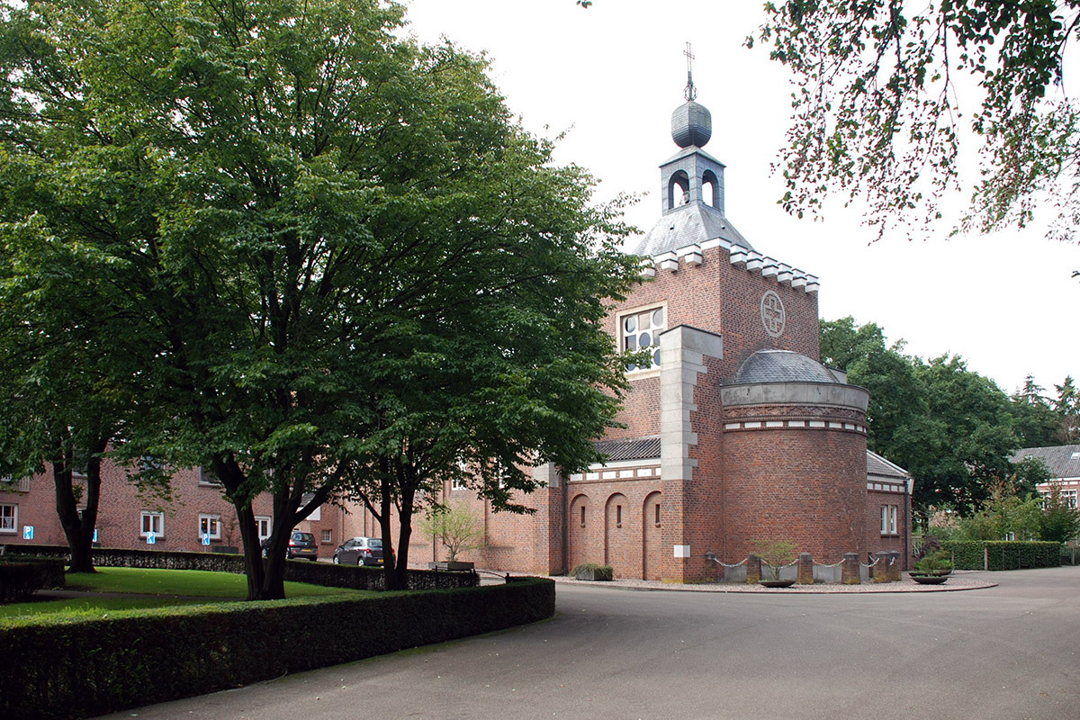 Kapel (E)Algemeen (hoofdvorm, kap):De kapel met nevenruimtes ligt aan de noordzijde in het verlengde van vleugel De en is toegankelijk vanuit de centrale hal binnen de voorvleugel. De kapel heeft één hoge bouwlaag, waarvan de goot op dezelfde hoogte ligt als bij de voorvleugel. Het zuidelijke deel heeft een rechthoekige opzet onder een met gesmoorde opnieuw verbeterde holle pannen gedekt zadeldak.Aan de noordzijde bevindt zich een forse toren, met tegen de oostzijde een lage zijbeuk. De toren heeft een omlopend, met grijze leien in Maasdekking gedekt schilddak, bekroond met een geheel met lood omklede lantaarn met galmgaten met een rondboogvormige beëindiging. De lantaarn heeft een met leien in Maasdekking gedekt tentdak met een enigszins gestileerde uivormige bekroning met vlakke zijden en afgeschuinde hoeken. Op de bekroning staat een sobere piron met opengewerkt smeedijzeren kruis. De oost- en westgevel van de toren hebben opmerkelijk zware steunberen, die de oostelijke zijbeuk volledig insluiten en tevens als topgevel fungeren voor de kap van het schip. Deze zijbeuk heeft een met gesmoorde opnieuw verbeterde holle pannen gedekte lessenaardak. Tegen de noordzijde van de toren bevindt zich een halfronde apsis onder een met grijze leien in Maasdekking gedekt koepeldak. Tegen de westzijde van de toren bevindt zich een rechthoekig enkellaags sacristie onder een flauwhellend, met gesmoorde opnieuw verbeterde holle pannen gedekt zadeldak, dat aan de westzijde afsluit met een tuitgevel. Tegen de westgevel bevindt zich een gemetseld bordes met smeedijzeren balustrade. Constructies:De kapel heeft dragende, als spouwmuur uitgevoerde gevels. Boven het schip is een reeks van vijf betonbalken in de gevels opgelegd. Op deze als zichtwerk uitgevoerde balken zijn dwarsmuren met drie forse rond bogen opgetrokken, waarin de zware dakgordingen zijn opgelegd. Hierover ligt een verticaal dakbeschot.De constructies van de zijbeuk, sacristie en toren zijn niet bekend, maar een traditionele opzet met houten spanten is waarschijnlijk. Gevels:De kapelgevels hebben dezelfde gevelopzet als de vleugels. Ook de apsis heeft dezelfde opbouw, maar hier heeft de gevel boven het fries een tweede fries met siermetselwerk in een ruitvorm. Boven dit tweede fries volgt een zeer hoge, licht geprofileerde kunststenen gootlijst. De westelijke topgevel van de sacristie heeft betonnen schouder- en dekstukken, thans met koperen afdekkingen.De torengevels sluiten aan de bovenzijde af met betonnen kantelen met (niet oorspronkelijke) koperen afdekkingen. Onder de vlakken tussen de kantelen steken trapeziumvormige betonnen consoles, eveneens met koperen afdekkingen, uit het gevelvlak. Deze consoles hebben in de bovenzijde een gootje, dat oorspronkelijk met lood bekleed, fungeerde als spuwer. De schipgevels (oost en west) hebben een zes traveeën brede opzet, waarbij de vijf noordelijke traveeën zijn uitgevoerd met rondboogvormige spaarnissen onder dubbele halfsteens bogen. Binnen de spaarnissen liggen hooggeplaatste rondboogvensters met dagkanten van afgeschuinde profielstenen. In de zuidelijke travee hebben beide gevels boven het orgelbalkon een rondvenster met dagkanten van afgeschuinde profielstenen. Alle vensters hebben betonnen traceringen met ronde en vierkante openingen, voorzien van gekleurd bewerkt glas. De oostgevel van de zijbeuk (naast de toren) heeft drie spaarnissen onder halfsteens rondbogen. Binnen elke spaarnis ligt een hooggeplaatst spleetvenster met bakstenen lekdorpel en halfsteens rollaag. In de openingen zitten stalen ramen. De geheel gesloten apsisgevel heeft een gepleisterde uitspringende plint en centraal siermetselwerk in een forse ruitvorm met daarbinnen negen kleinere ruiten. De ruiten worden omgeven door halfsteens rollagen, met op de kruisingen ruw bewerkte kunststenen blokjes. Rond deze gevel staat een reeks gemetselde, zich naar boven toe versmallende posten met gepleisterde | 10 |