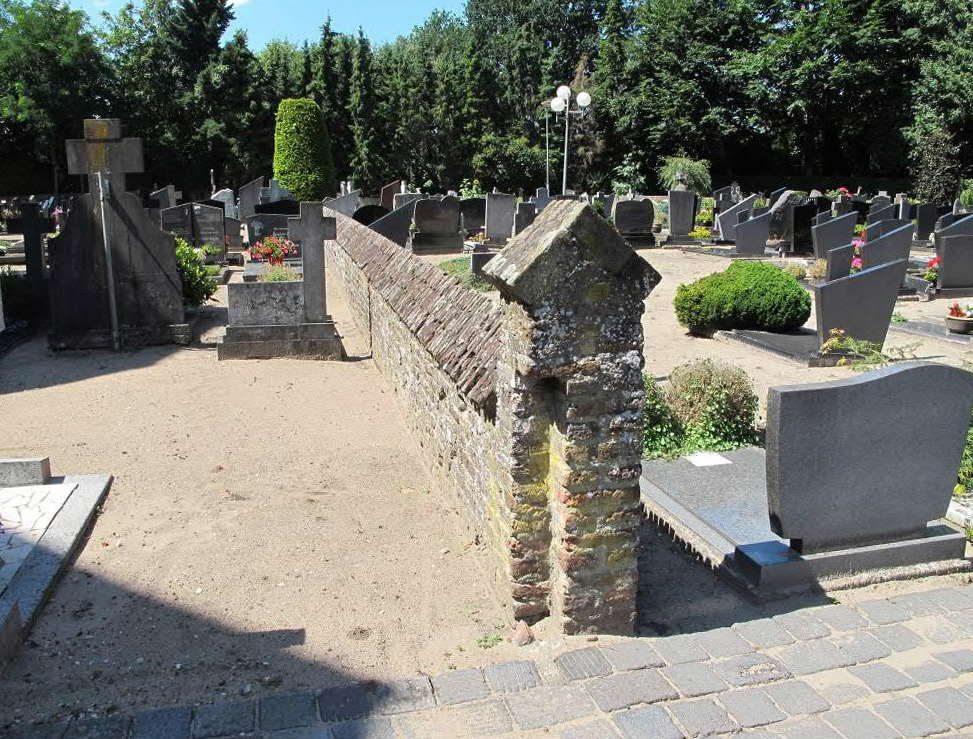 ContextDe onregelmatig gevormde begraafplaats bevindt zich ten noorden en noordoosten van de in 1951 vernieuwde Sint-Jan’s-Onthoofdingskerk. Voordat deze kerk in 1944 werd verwoest kende deze een voorganger in neogotische stijl uit 1859.Ter plaatse van de begraafplaats werd in 1802 de uit de achttiende eeuw daterende schuurkerk vervangen. Deze kerk is op het kadastraal minuutplan herkenbaar als een fors rechthoekig bouwdeel dat zich ten noordoosten van de huidige kerk bevond. De huidige verkaveling voert mogelijk deels terug op deze vroegere kerk. De lage gemetselde muur, die de noordwestzijde van de huidige begraafplaats begrensd vormde vermoedelijk in deze periode al de begrenzing van het terrein. BeschrijvingDe muren zijn opgetrokken in een donkerrode handvorm baksteen in kruisverband. Bij het muurdeel ten noorden van de entree tot de begraafplaats en langs de aansluitende noordwestrand van de begraafplaats komen bakstenen met een formaat tot ca. 23 x 11,5 x 4/4,3 cm voor met een vermoedelijk 18de-eeuwse oorsprong.Het bovenste deel van deze muur kent overwegend baksteen van ca. 22 x 10 x 4,3 cm, passend bij een datering in de vroege 19de eeuw en daarmee het moment dat de schuurkerk werd vervangen. Verder komen veel incomplete stenen voor van ca. 21 x 10,5 x 5 cm. Dit betreft waarschijnlijk latere reparaties. Bij het noordoostelijke deel van de gemetselde muur overheerst laatstgenoemde 19de-eeuwse baksteen. Bij het oostelijke deel van de begrenzing langs de noordwestzijde van de begraafplaats is een recente, niet beschermenswaardige muur in beton aanwezig Het middels een ezelsrug afgedekte muurdeel ten noorden van het koor van de huidige kerk heeft aanzienlijk forsere baksteen van ca.24/24,5 x 12/12,5 x 5/5,5 cm, wat algemeen wijst op een vroegere datering. Het is waarschijnlijk dat (delen van) deze muur het restant vormt van de vroegere kerkgebouwen. De aangebrachte ezelsrug is bij het westelijke deel uitgevoerd in baksteen van 22 x 4 cm, passend bij een datering in de vroege 19de eeuw. Bij het oostelijke deel is de ezelsrug recent vernieuwd. | 2 |
