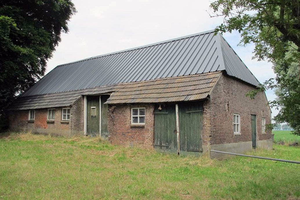 Context(Bouw)historie:De boerderij Nulandsestraat 15 werd in de 19de eeuw nieuw gebouwd. Het kadastrale minuutplan (1811-1832) geeft op de plaats van de huidige boerderij dan ook nog geen bebouwing weer. De in de naar de straat gerichte zuidgevel opgenomen baksteen met ingekerfde datering ‘1864’ zal daarom vrijwel zeker het moment van de bouw markeren.De gehanteerde handvormbaksteen past sluit aan bij de datering. De Nulandsestraat behoort tot een oudere, in oost-westelijke richting lopende wegenstructuur en één van de oude hoofdverbindingen tussen Rosmalen en Geffen. Het historische karakter met beperkte verspreide bebouwing is goed bewaard gebleven en de oudere, parallel aan de straat gebouwde boerderijen zijn daarbij zeer karakteristiek. De boerderij heeft diverse verbouwingen ondergaan, waarvan geen documentatie is aangetroffen. Op basis van de iets afwijkende baksteen van de achtergevel en het achterste deel van het achterhuis lijkt hier sprake van een uitbreiding of latere verstening van eerder in hout uitgevoerde gevels. Vanwege de afwijkende achterste twee gebinten is ook volledige vernieuwing van het achterste deel van de boerderij niet uit te sluiten. Vermoedelijk in 1961, werd de indeling van de voorgevel naar de heersende mode opnieuw ingedeeld met grote rechthoekige vensters. Daarbij werd ook de tot dan toe in de rechter zijgevel gesitueerde toegang van het woongedeelte naar de voorgevel verplaatst. Een baksteen met ingekerfd jaartal “1961” naast de vroegere toegang herinnert aan deze ingreep. Tegelijkertijd werd ook de linker zijgevel van zowel het voorhuis als het achterhuis iets verhoogd. De linker zijgevel van het achterhuis kreeg daarbij de huidige betonnen stalramen en ook de in deze gevel aanwezige opgeklampte staldeur werd, gezien het omliggende vernieuwde muurwerk op hetzelfde moment op de huidige plaats ingevoegd. Bij de achtergevel dateren de twee betonnen stalramen vermoedelijk van dezelfde verbouwingsfase. De in deze gevel aanwezige opgeklampte deur is niet oorspronkelijk, maar behoort wel tot een eerdere verbouwingsfase. Bij de rechter zijgevel zijn de dubbele staldeuren, geheel rechts in de gevel later ingevoegd. Bij het geveldeel, links van de dwarsdeeldeuren zijn alle gevelopeningen gewijzigd. In alle gevallen zijn onder de huidige vensters sporen aanwezig die er op wijzen dat de openingen eerder als deuropening hebben gefungeerd. Opmerkelijk is het linker venster, dat wordt gevormd door het bovenlicht van een voordeurkozijn. Het is echter de vraag of dit kozijn uit deze boerderij afkomstig is. In 1962 werd voor rekening van J. v.d. Kamp ten zuiden van de boerderij de nog aanwezige schuur gebouwd. In 1969 werd, wederom voor rekening van J. v.d.Kamp, ten westen van de boerderij een nieuw woonhuis gebouwd. Daarmee kwam de woonfunctie binnen de boerderij te vervallen. Bij het woongedeelte van de boerderij werd bij deze bouwaanvraag de opmerking “te slopen krot” geplaatst. Deze sloop heeft echter niet plaats gevonden. Recent heeft de huidige eigenaar het eerder met riet gedekte bovenste dakgedeelte voorzien van een dekking met stalen profielplaten om het dak weer waterdicht te maken. Daarbij hebben ook de nodige verstevigingen in de constructie plaats gevonden. | 2 |