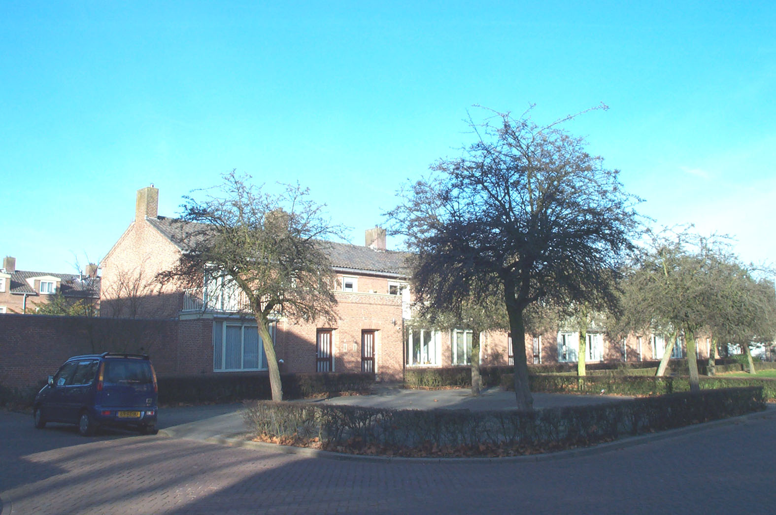 Aaneengesloten blok van acht eengezinswoningen, twee aan twee in spiegelbeeld geplaatst. Opmerkelijk is de vooruitstekende voordeurpartij , ter hoogte van de scheidingsmuur, met twee toegangen, waarin de borstwering voor het balkon op de eerste bouwlaag is geintegreerd. Tussen de vooruitstekende voordeurpartij zijn links en rechts van de scheidingsmuur twee erkers aangebracht, waarboven een balkon voorzien van een metalen hekwerk, dat met het balkon boven de voordeurpartij een geheel vormt. Het doorlopend balkon is ter hoogte van de scheidingsmuren voorzien van een glazen scheidingswand. De woningen zijn voorzien van een aaneengesloten zadel dak gedekt met gauwe Hollands verbeterde pannen. De goten zijn uitgevoerd in zink, bevestigd met beugels. Bij de woningen behoren een aantal garageboxen. Voor de woningen is een breed trottoir met daarvoor een gazon, en is omzoomd door een haag.