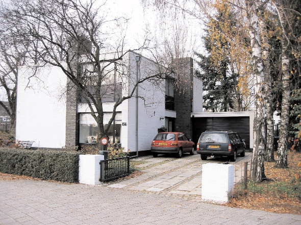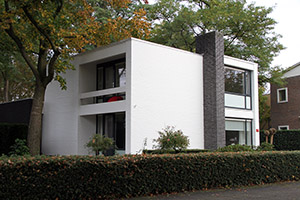 BeschrijvingAlgemeen:Vrijstaande villa gebouwd in functionalistische stijl, bestaande uit een min of meer vierkant tweelaags bouwdeel met plat dak en een eenlaags aanbouw op een rechthoekige grondslag. In de oksel van het tweelaags deel en de eenlaags aanbouw is later een tweede eenlaags aanbouw toegevoegd.Kenmerkend voor de stijl waarin deze villa, naar ontwerp van architect H.M. de Graaf, is gebouwd, is het openwerken of transparant maken van de omsluitende gevelmuur om zo binnen- en buitenruimte met elkaar in verbinding te brengen en in elkaar over te laten lopen. Dit komt in de villa tot uitdrukking in de kale, witte gevelvlakken van bepleisterde baksteen van het rechthoekige blok dat de woning vormt, onderbroken door prominent vormgegeven schoorsteenpartijen en grote glasoppervlakken gecombineerd met inpandige balkons. De gevels hebben een asymmetrische opbouw en zijn als het ware alzijdig: een duidelijk onderscheid tussen bijvoorbeeld voor- en achtergevel is min of meeR weggevallen. In de vormentaal overheerst de rechte hoek. Voorgevel (Ophoviuslaan):De voorgevel omvat de begane grond en de eerste verdieping en bestaat uit twee delen, van elkaar gescheiden door een als zelfstandig, rechthoekig volume ontworpen rookkanaal, uitgevoerd in blauwgeglazuurde bakstenen. Dit rechthoekige volume staat haaks op beide geveldelen, die op dit punt verspringen ten opzichte van elkaar. Het linker geveldeel is uitgevoerd in baksteen en vervolgens witgeverfd met een zwarte plint. Het gevelvlak is gesloten en bezit geen gevelopeningen. Het rechter geveldeel ligt ten opzichte van het linkermuurvlak een stuk naar voren. Dit deel wordt gevormd door een grote gevelopening. De begane grond en de eerste verdieping zijn van elkaar gescheiden door de tot in het gevelvlak doorlopende gewapende betonconstructie van de verdiepingsvloer. Boven de eerste verdieping is een betonnen latei aangebracht. De gevelvulling op de begane grond en de eerste verdieping bestaat uit grotere en kleinere glasvlakken in houten kozijnen, geplaatst op een borstwering van houten panelen.De voorgevel van de eenlaags garageaanbouw die zich rechtsachter de woning bevindt, wordt volledig ingevuld door een brede houten garagedeur. Linkerzijgevel (Adriaan van Ostadestraat):Ook de linker zijgevel kent een tweedeling in een gesloten wit gevelvlak links en brede gevelopening ter hoogte van de begane grond en de eerste verdieping rechts. Deze gevelopening is ingevuld door twee inpandige loggia’s, voorzien van grote glasvlakken boven een houten borst- | 1 |