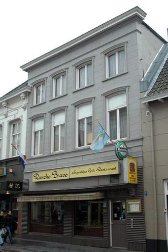 worden aan het zicht onttrokken door plaatmateriaal. Op de verdieping, boven een cordonlijst, heeft de gevel vier getoogde vensters met een gestucte geprofileerde omlijsting. Deze bevatten dubbele draairamen en een met plaatmateriaal dichtgezet bovenlicht. De vier getoogde vensters op de tweede verdieping hebben ook een gestucte geprofileerde omlijsting en bevatten dubbele draairamen zonder bovenlicht. De brede gevel wordt afgesloten door een hoofdgestel met architraaf, fries en kroonlijst. Zijgevels:Het pand wordt aan beide zijden begrensd door bebouwing. Het rechter buurpand is lager, waardoor een klein deel van de rechter zijgevel van het onderhavige pand zichtbaar is. Dit bovenste deel van de gevel is blind uitgevoerd en is gepleisterd. Een eenvoudige lijst sluit de gevel af. In een documentatierapport uit 1978 staat de linker zijgevel van het hoofdpand als volgt beschreven: De zijgevel van het hoofdpand heeft vensters met 6-ruits schuiframen.Achtergevel:De achtergevel is niet zichtbaar vanuit de openbare ruimte. In een documentatierapport uit 1978 wordt kort de achtergevel van het tweede achterhuis als volgt beschreven: De gevel van het achterhuis heeft vensters met 6-ruits schuiframen met zwikken XIXA.Ruimtelijke indeling:In een documentatierapport uit de jaren 1980 is het volgende opgenomen over de ruimtelijke indeling van het pand: In het voorhuis is op de verdieping een stookplaats tegen de rechter zijmuur. Aanvankelijk was deze ook op de begane grond aanwezig. Tegen de achtergevel van het eerste achterhuis bevond zich zowel op de begane grond als op de verdieping een stookplaats.Op de verbouwingstekening uit 1981 is de ruimtelijke indeling van het pand als volgt weergegeven: de begane grond van het geheel (voorhuis en achterhuizen) is één grote ruimte en volledig in gebruik als restaurant. Tegen de rechter zijgevel van het tweede achterhuis is de trap naar de verdieping. Hier is het achterste deel van het tweede achterhuis in gebruik voor het restaurant. De rest van de verdieping is ingericht als woning. Tegen de linker zijgevel van het voorhuis zit de trap naar de tweede verdieping van het voorhuis. Hier zijn, net als op de zolderverdiepingen van de achterhuizen, slaapkamers ingericht. Constructies: | 3 |