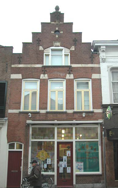 raam met aan weerszijden een lager zijlicht) waarvan de invulling vernieuwd is. Boven de zijlichten zit een natuurstenen plaat met een bladmotief. Ook dit venster heeft een hardstenen lekdorpel en een ontlastingsboog met natuurstenen aanzetstukken. De sluitsteen in de ontlastingsboog heeft een cartouche met daarin het jaartal 1886. Geheel boven in de geveltop zit een oculus. De trappen van de gevel zijn gedekt met hardstenen dekplaten en op de centrale trap staat een natuurstenen vaasvormig ornament. Verder bevat de gevel ter hoogte van de kapconstructie sierankers. Zijgevels:Het pand wordt aan beide zijden begrensd door bebouwing.Achtergevel:De achtergevel is wat betreft het benedendeel geheel doorgebroken naar de achterbouw. Het bovendeel is gepleisterd en voorzien van nieuwe kozijnen en ramen.Ruimtelijke indeling:De begane grond vormt één open ruimte met de eenlaags aanbouw tegen de achtergevel en is geheel in gebruik als winkel/keuken/berging. Tegen de linker zijmuur zit de trap (1988) naar de verdieping en tegen de rechter zijmuur loopt een rookkanaal. Op de verdieping en zolderverdieping zijn de woonvertrekken, met een volledige nieuwe indeling. Indeling en afwerking hebben geen monumentale waarde.Constructies:De in een documentatierapport uit 1979 vermelde constructies (enkelvoudige balklagen, resten van een samengestelde balklaag in de verdiepingsbalklaag) zijn waarschijnlijk niet meer aanwezig. De zolderbalklaag is in 1988 geheel vernieuwd. De kap bestaat uit eenvoudige Hollandse spanten. De linker zijmuur (van de steeg) is gemeenschappelijk met het buurpand en dateert mogelijk uit de 17de eeuw. Ook de rechter zijmuur is gemeenschappelijk met het buurpand.Interieurelementen:Waardevolle interieurelementen zijn niet meer aanwezig.Erf, bijgebouwen, diversen:De vier voormalige 19de-eeuwse arbeiderswoningen op het achtererf zijn in 1947 verbouwd tot bergingen en ook daarna nogmaals ingrijpend gewijzigd, waardoor van de oorspronkelijke situatie weinig behouden is gebleven. Wel is de steeg nog herkenbaar die langs de voorgevels van de huisjes liep. | 3 |