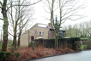 Vrijstaande woning met lessenaardaken, aan de voorzijde en achterzijde van gevelpuien voorzien. Aan de voorzijde is de borstwering in de gevelpui bekleed met houten delen. Het geheel is uitgevoerd in schoonmetselwerk in baksteen.