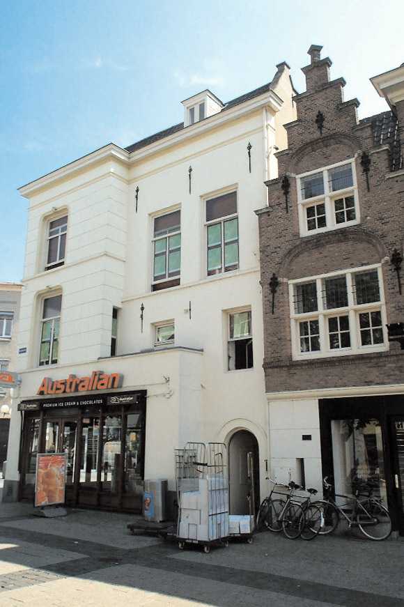 BeschrijvingAlgemeen:Het pand Pensmarkt 17-19 / Markt 44 is gelegen binnen het bouwblok dat zich op het marktplein bevindt, te weten de Markt, de Pensmarkt en de Schapenmarkt. Het pand heeft zijn oorsprong in twee afzonderlijke bouwmassa’s, die rond 1900 zijn samengevoegd. In het bouwdeel aan de Pensmarkt bevinden zich in de muren nog restanten van de middeleeuwse stadshal (vermoedelijk de vleeshal).Het bouwdeel aan de Pensmarkt telt vijf niveaus, namelijk een kelder, een begane grond, twee verdiepingen en een zolderverdieping. Het dak bestaat uit een platdak met een schild aan de voorzijde, dat aansluit op het zadeldak van de dwarsbouw aan de Markt. Het dak heeft een bitumineuze dakbedekking. In dit dakvlak bevindt zich een dakkapel met plat dak, afgedekt met leien. De ondiepe uitbouw aan de voorzijde, thans onderdeel van een moderne winkelpui, vormt vermoedelijk een restant van een voormalig pothuis en heeft een platdak. Tegen de oorspronkelijke kopse gevel van het bouwdeel aan de Pensmarkt, op de hoek Pensmarkt- Markt, is een ondiepe dwarsbouw geplaatst. Dit hoekpand heeft een opbouw in vijf niveaus, te weten een kelder, een begane grond, twee verdiepingen en een zolderverdieping onder een zadeldak. Behalve de laat-middeleeuwse kelder, voorzien van tongewelf, dateert de huidige bouwmassa grotendeels uit de 18e eeuw. De neo-classicistische vormgeving van de gevels is in de latere 19de eeuw tot stand gekomen, gelijk met de enkelvoudige balklagen boven de verdiepingen en de kapconstructie. De begane grond van het hoekpand en het bouwdeel aan de Pensmarkt zijn tegenwoordig samengevoegd tot één ruimte. De voormalige scheidingsmuur tussen beide bouwdelen is op dit niveau verdwenen. Gevel aan de Pensmarkt:De neo-classicistische gevel aan de Pensmarkt bestaat uit drie delen: een uitspringend deel, horende bij het hoekpand; rechts hiervan een met een sprong teruggelegde gevel horende bij de voormalige langsbouw; en tot slot de uitbouw ter hoogte van de begane grond van het hoekpand. De gevel van het uitspringende deel is gepleisterd en voorzien van blokmotief en wordt voortgezet in de gevel grenzend aan de Markt. Op de eerste en tweede verdieping bevinden zich twee T-vensters in een geprofileerde gevelopening met afgeronde hoeken en een kuif. De vensters zijn geplaatst op raamdorpels die samenvallen met de waterlijsten, die over de volle breedte van de gevel doorlopen. In de uitbouw ter hoogte van de begane grond is een moderne winkelpui aangebracht. Deze uitbouw loopt door tot halverwege het terugliggende rechter deel van de gevel. | 1 |