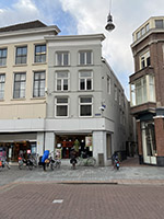 twee kruiskozijnen getekend, in de top één, alle voorzien van een ontlastingsboog. Speklagen, waterlijsten en een kleine timpaan op de top sieren de gevel. Op de tekening is geen kelderingang zichtbaar, alhoewel er aan de rechter zijde wel een geweest is. Onder de straat bevond zich een kleine straatkelder. De kelder onder het huis, die nu niet meer toegankelijk is, stond vroeger in verbinding met de kelder onder het buurpand. Dit zal al in de 16de eeuw het geval zijn geweest aangezien er dan in beide panden een bakker werkzaam is. Bij de verbouwing in de 17de eeuw zal deze doorgang zijn dichtgezet. Op de begane grond is eveneens een verbinding met het buurpand geweest, die toen ook zal zijn dichtgezet. Het gehele pand is bij deze scheiding geheel verbouwd, waarbij het houtskelet gesloopt is en vervangen door zware consoles met een ojiefprofilering. Achter het pand stond een iets smaller achterhuis, waarvan de tussenmuur vermoedelijk in de 15de eeuw vernieuwd is. De gemeenschappelijke zijmuur met het buurpand dateert ook uit de 15de eeuw. Mogelijk zijn de twee panden op het hoekperceel toen gelijktijdig gebouwd en stonden ze vanaf de bouw met elkaar in verbinding. Aangezien het pand in de 19de eeuw wederom ingrijpend verbouwd is, waarbij onder andere de kapconstructie werd vervangen, is de oude indeling niet meer goed na te gaan. Bouwsporen in de verdiepingsbalklaag duiden op een spiltrap in de linker achterhoek en mogelijk een rookkanaal tegen de linker zijmuur. | 264 |