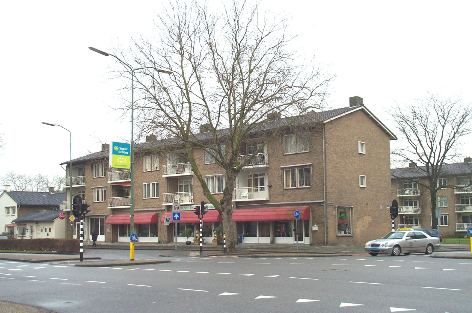 Dit blok van winkels en flatwoningen komt voor wat betreft de flatwoningen overeen met de drie flatgebouwen aan de Zuiderparkweg (228 t/m 274) en de Palestrinastraat (101 t/m 123). Het verschil is dat in het grondplan een viertal winkeleenheden zijn opgenomen. In de blokken aan de Zuiderparkweg zijn de voordeuren naar elkaar toe gericht. De elementen bestaan uit drie bouwlagen met een souterrain. Ieder gebouw heeft twee trappenhuizen. In deze gevelwand zijn alle bouwlagen voorzien van schuin uit de gevel stekende, inpandige balkons, met uitzondering van het flatgebouw aan de Pettelaarseweg waar in de eerste bouwlaag de winkels en een magazijn met achteruitgang zijn gesitueerd. De daken hebben een flauwe helling en een brede overstek aan beide zijde. Aan de andere zijde zijn de woningen voorzien van uitpandige, hangende balkons. De gebouwen hebben een zadeldak met 'flauwe' hellingshoek. Tussen de flatgebouwen zijn open ruimten met gazon of parkinrichting.