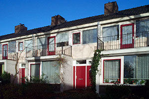 Woningen zijn van hetzelfde type als de woningen in de Bachstraat. Deze woningen zijn echter uitgevoerd met een erker met balkon. De kozijn-pui op de eerste bouwlaag is daartoe voorzien van een balkondeur.
