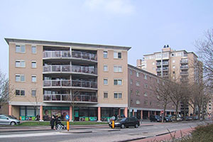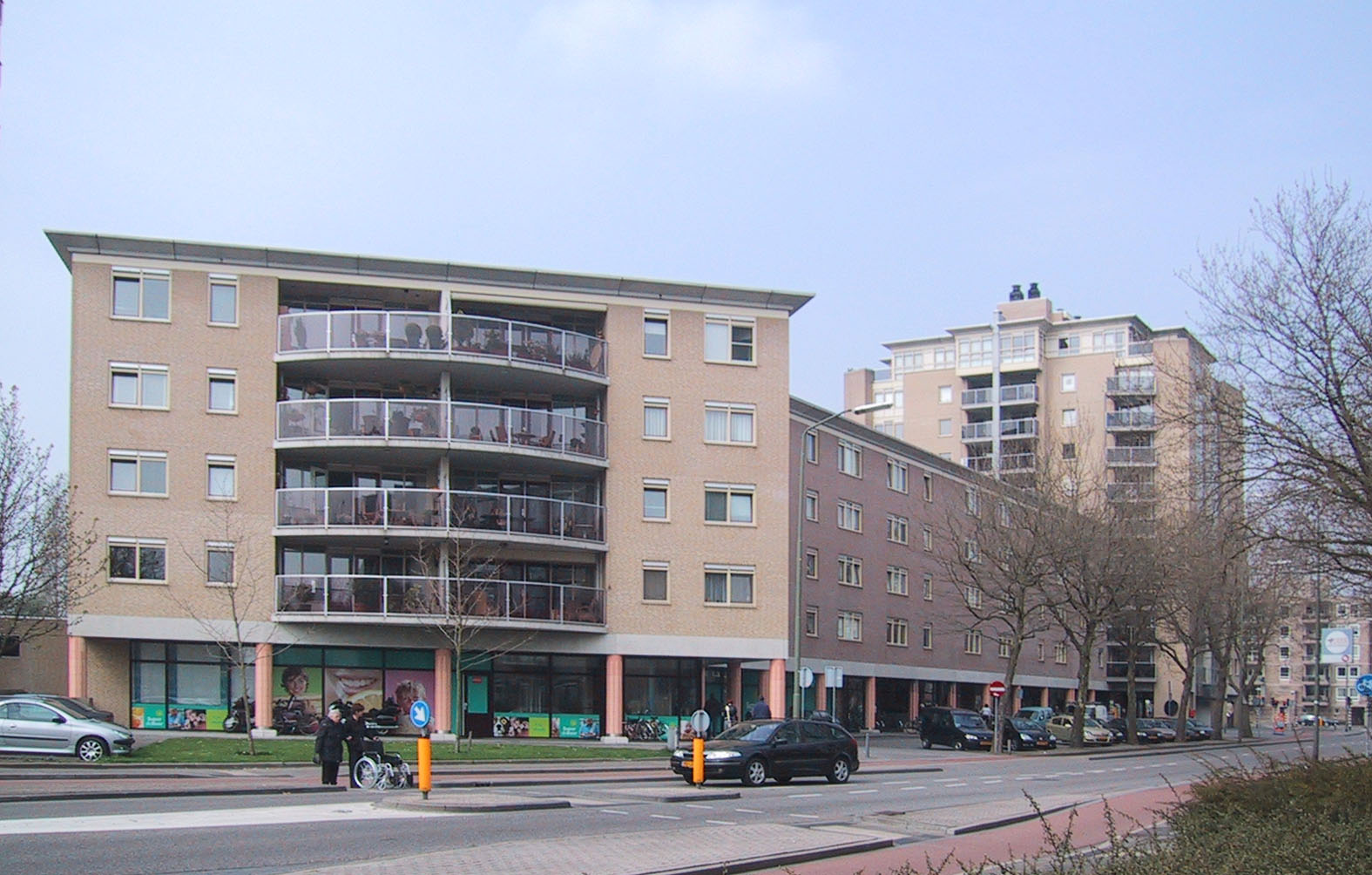 Begin jaren negentig werd de bouwmassa met winkels en bovenwoningen uit 1967 gesloopt ten behoeve van een nieuw woon- en winkelcomplex met meerdere bouwlagen. Het betreft hier twee bouwblokken, die ten opzichte van elkaar in een hoek geplaats zijn. Het complex volgt daarbij de rooilijn van de Pettelaarseweg en het zich ter plaatsen verbredende Sweelinckplein. Het complex is samengesteld uit: begane grond en vier bouwlagen. De beganegrond, met een galerij met zuilen, is ingericht voor winkels. Opvallend is op de begane grond de cordonlijst als markering tussen winkel en woongedeelte. De platte daken hebben een brede overstek.