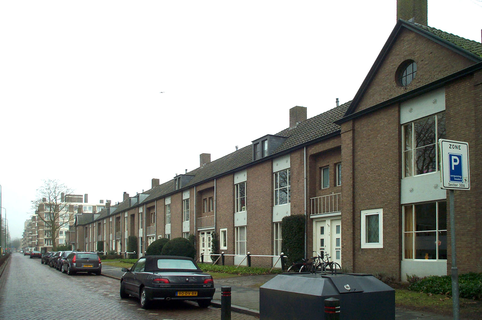 Oudhollandse pannen. Ze hebben houten lijstgoten en bakstenen schoorstenen. Op het voorschild bevinden zich houten dakkapellen met een plat dak en twee van 4-ruits roedenverdeling voorziene ramen. In sommige gevallen behielden de dakkapelwangen hun leidekking. Op enkele plaatsen zijn dakramen toegevoegd. De op de achterschilden gelegen dakkapellen zijn breder en liggen verzonken in het dakvlak. Het metselwerk van de gevels bestaat uit rosebruine handvormsteen in Vlaams verband. In de vensters bevinden zich stalen ramen en de deuren zijn in hout uitgevoerd. Waar vernieuwing plaatsvond is zorgvuldig aangesloten bij de oorspronkelijke opzet. Voorgevel:Van ieder blok wordt de voorgevel gekenmerkt door een symmetrische indeling, met brede hoekrisalieten met een houten timpaan met een gemetseld front waarin zich een oculus bevindt. De risalieten worden langs de randen geleed door gemetselde lisenen. Een asymmetrisch langs het risaliet gelegen verticale vensterstrook heeft op beide verdiepingen een drielichtsvenster. Betonstroken markeren de onder- en bovenzijde van de vensters en zijn langs de buitenzijden van het complex verlevendigd met gesmede stermotieven. Vergelijkbare verticale vensterstroken geleden de overige geveldelen van de blokken. Aan de Hertog Janstraat zijn de betonstroken verlevendigd met cirkelvormen en hebben ze kwartholle hoeken op de begane grond. De vensterstroken zijn in tweetallen gerangschikt en worden afgewisseld door verticale gevelnissen waarin de ingangspartijen zijn gesitueerd, telkens drie ingangen per strook. De deuren verschillen per blok, onder meer met twee enkelruits deurramen of met één deurraam met 4-ruits roedenverdeling. Op de bovenverdieping zijn de nissen voorzien van stalen sierhekken en hier bevat iedere nis drie kleine vensters met een enkelruits raam. Voorts, langs de Hertog Janstraat hebben de (brede) vensters een (vernieuwd) persienne-luik.Zijgevels:Aan de kopzijden zijn de blokken nagenoeg blind en bevindt zich slechts een enkel venster.Achtergevel:Aan de achterkant worden de blokken gekenmerkt door puien met tuindeuren en zijn er langs de bovenverdieping ononderbroken doorlopende betonnen balkons met eenvoudige ijzeren hekwerken met gaasbespanning.Op enkele plaatsen is de achetrgevel uitgebouwd met daardoor bredere balkons. Puien met balkondeuren worden afgewisseld door ingangen met een enkelvoudige deur. Verder zijn er ook hier (houten) persienne-luiken. | 5 |