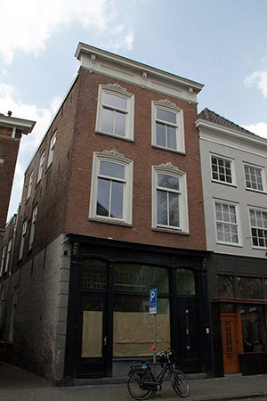 kuifje. De kozijnen en ramen van deze vensters zijn in 2000 naar het oude voorbeeld vernieuwd. Onder de vensters een hardstenen lekdorpel. De gevel wordt afgesloten door een hoofdgestel met architraaf, fries met verdiepte velden en een kroonlijst op drie consoles. ZijgevelsHet pand wordt rechts begrensd door bebouwing. De linker zijgevel ligt aan het Lamstraatje. Zoals gezegd zijn de verdiepingen in de 19de eeuw vernieuwd. Dit is zichtbaar in het metselwerk van de zijgevel. Het metselwerk ter hoogte van de kelder en begane grond dateert uit de 16de eeuw, terwijl het hoger gelegen metselwerk duidelijk met machinale baksteen is gebouwd. De begane grond is over de gehele breedte van de gevel geschilderd, over de resten van pleisterwerk.Over de gehele breedte van de gevel zijn in deze bouwlaag vier (dichtgezette) kelderlichten zichtbaar. De drie vensters met 8-ruits schuiframen in de begane grond zijn tijdens de verbouwingswerkzaamheden in 2000 nieuw aangebracht. Net voor het eerste achterhuis zit een kleine ingang in de gevel. Van de vier bestaande vensters op de eerste verdieping zijn de kozijnen en T-schuiframen vernieuwd. Dit geldt ook voor de kozijnen en | 2 |
