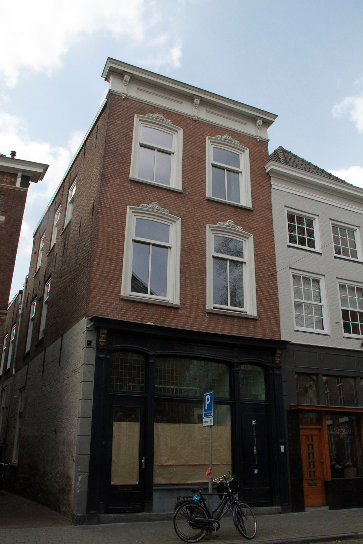 Het pand Postelstraat 30-32, op de hoek met het Lamstraatje, heeft een voorhuis met twee vaste achterhuizen.