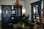 delvormig middenstuk, waarin eveneens blad- en bloemmotieven zijn aangebracht. Daarbij bevindt de plafondhanger met kroonluchter zich in een soort scheipmotiefvan bladgoud. De rondlopende lambrisering lijkt nog oud, maar het linnen behang is hoogstwaarschijnlijk later aangebracht. De achtergevel van deze ruimte, die zich nog op de plaats van het oorspronkelijke vierkante gebouw bevindt, is in 1940 grotendeels vernieuwd. Dit is er de oorzaak van dat er thans niet bij de binnenarchitectuur passende T-draairamen in aanwezig zijn. De nog wel oorspronkelijke binnenluiken geven door hun vakverdeling aan dat hier oorspronkelijk ook 8-ruits schuifvensters aanwezig zullen zijn geweest. In algemene zin geldt voor de verdieping hetzelfde als wat voor de begane grond geldt, namelijk dat de achterste helft van het huidige gebouw door de ingrijpende verbouwing van 1940 nauwelijks meer historische structuren bezit. Ook op de verdieping vinden we de driedeling van het gebouw terug. De ruimten zijn door allerlei secundaire wanden opgedeeld en de schouw is verdwenen. Mogelijk is er nog een oude balklaag, maar door de vlakke moderne zoldering van houten planken is dit niet meer na te gaan. Het trappenhuis is ook op dit niveau grotendeels oorspronkelijk. Het is uitgevoerd in empire-stijl en bezit gesneden balusters in de leuning. Ter plaatse van het trappenhuis is er in de zijgevel een oorspronkelijk glas-in-lood raam aangebracht.