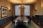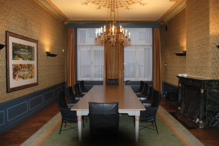 De vergaderkamer zelf bezit tegen de rechter zijmuur een zeer rijk vormgegeven groen-zwart marmeren stookplaats op kolommen met messing kapitelen en basementen. In de stookplaats is een oudere (17eeeuwse) haardplaat opgesteld. Het meest in het oogspringend in deze ruimte is echter het gepolychromeerde stucplafond met halfronde randlijst met blad- en bloemmotieven en vierkante hoekstukken dat recent, in 2008, is gerestaureerd. Er is een aman-