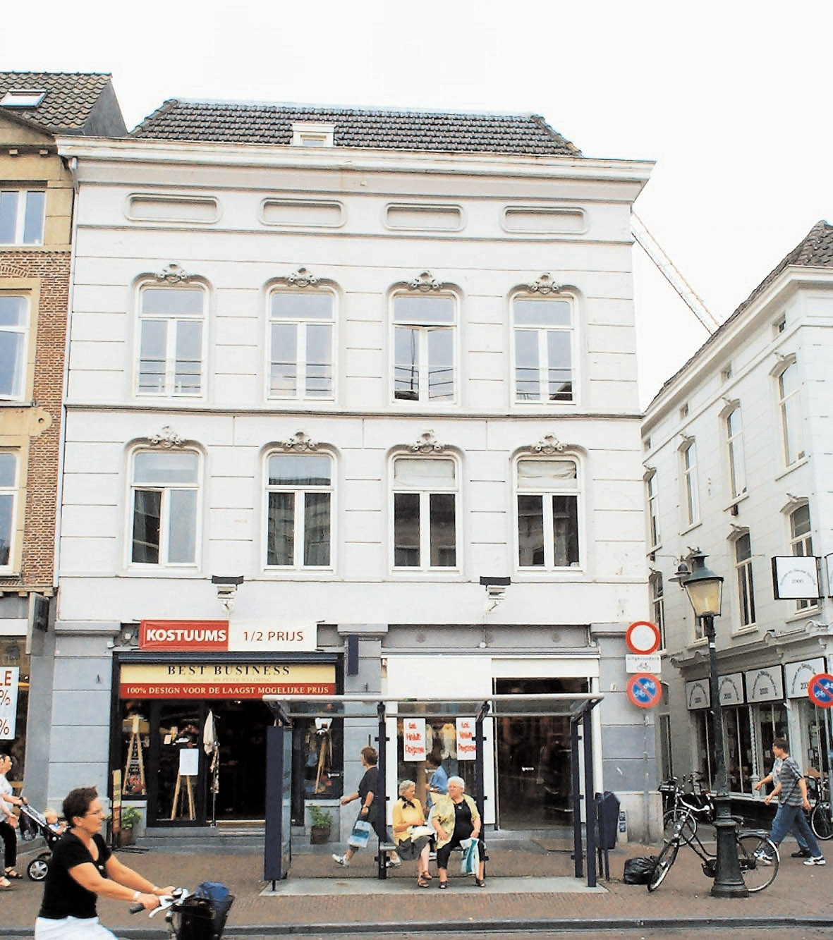 gevelankers ten behoeve van de balklagen. De rechter zijgevel van het lagere bouwdeel is op de begane grond geheel vernieuwd en voorzien van een glazen etalage. In de borstwering bevinden zich drie getoogde kelderlichten. Op de eerste verdieping bevinden zich in de kruisverband opgetrokken laat 19de-eeuwse gevel vijf gevelopeningen. Deze gevelopeningen bevatten T-vensters met schuivend onderraam en zijn voorzien van een gecementeerde raamdorpel en anderhalf steens strekken met zandstenen aanzet- en sluitstenen. Boven de vensters van de eerste verdieping bevindt zich een eenvoudig geprofileerde waterlijst. De waterlijst is door middel van vijf kleine pilasters op consoles met de geprofileerde uitkragende bakgoot verbonden. Tussen de pilasters bevinden zich drie dubbele ramen met stenen muurdam.