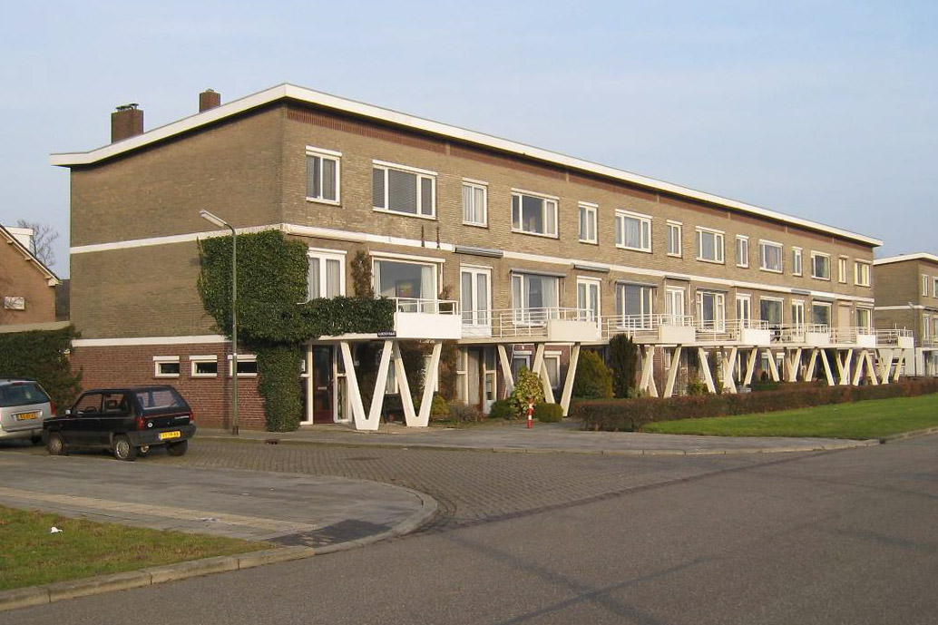 bevinden zich kleine toegangswegen die naar de inpandige garages leiden. BeschrijvingAlgemeen (hoofdvorm, kap):De drie blokken bestaan elk uit zeven woningen met aan de achterzijde een inpandige garage (drive in). Ze tellen drie bouwlagen en hebben een plat dak. De daken volgen een schuine helling doordat ze naar het zuiden toe oplopen. Langs de achterzijde maken ze een knik. Langs de overstek hebben de daken niet oorspronkelijke boeilijsten. De betonconstructie waarin de blokken zijn opgetrokken wordt door gemetselde gevels aan het zicht onttrokken, maar de betonnen verdiepingsvloeren bleven in het zicht. Op de begane grond bestaat het metselwerk uit roodbruine baksteen. Verder zijn de gevels in gele baksteen uitgevoerd. Ze zijn in een wild verband gemetseld. Alhoewel er diverse detailwijzigingen plaatsvonden behielden verschillende woningen hun oorspronkelijke ramen en deuren. De deuren en kozijnen zijn in hout uitgevoerd, met de draaiende raamdelen in staal.Voorgevel:Aan de voorzijde (zuidkant) worden de drie blokken op de begane grond gekenmerkt door betonnen staanders die aan de bouwmassa voorafgaan en de in dito materiaal uitgevoerde balkons dragen. Iedere staander bestaat uit twee diagonale stijlen. Ze gaan vooraf aan de ingangen van de woningen waardoor ze tezamen met de balkons een portiek vormen. De ingangen zijn ingevuld met een pui met een enkelvoudige toegangsdeur tussen twee nevenlichten. De deuren zijn voorzien van een deurraam. Rechts van de ingang hebben de woningen telkens twee vensters met een enkelruits (zonder roedenverdeling) raam. De balkons worden afgeschermd door een stalen hekwerk dat aan de voorkant evenwel is gecombineerd met een lage betonnen borstwering. Puien met een dubbele deur bieden toegang tot de balkons. Rechts van de balkons accentueert een breed woonkamervenster de opzet van de tweede bouwlaag als bel-étage. In de oorspronkelijke opzet hebben deze vensters een middenraam met nevenlichten die zijn gecombineerd met een bovenlicht. Op de bovenste verdieping hebben de woningen links een venster met een dubbel draairaam en rechts een breed venster. De brede vensters zijn in de oorspronkelijke opzet voorzien van een middenraam en twee nevenlichten. Een strook met twee rollagen in rode baksteen vormt per woning de beëindiging van de gevel. De stroken worden door smalle geveldammetjes in gele baksteen van elkaar gescheiden. | 3 |