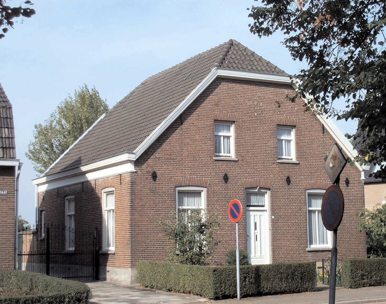 BeschrijvingAlgemeen:Dit vrijstaande sobere woonhuis uit de vroege twintigste eeuw is gelegen aan de rustieke Dorpsstraat. Het pand, met begane grond en zolderniveau, heeft een rechthoekige grondslag en is met de korte zijde naar de straat gekeerd. De gevels zijn in kuisverband gemetseld en voorzien van een grijze gecementeerde plint, het zadeldak is met moderne gesmoorde pannen gedekt. Tegen een deel van de achtergevel bevindt zich een kleine eenlaags aanbouw met een lessenaardak, de voormalige keuken. Op het achtererf staat een vrijstaand bijgebouw met een met muldenpannen gedekt zadeldak, dat onder een kleine hoek op het woonhuis georiënteerd is.Voorgevel:In de symmetrische voorgevel wordt de (vernieuwde) voordeur met bovenlicht aan beide zijden geflankeerd door een T-venster met vast rechthoekig bovenlicht en schuivend onderraam. De eerste verdieping is geleed met twee kleinere T-vensters die eveneens voorzien zijn van een vast boven- en schuivend onderraam. De strekse bogen boven de gevelopeningen op de begane grond zijn in tegenstelling tot de gevelopeningen op de eerste verdieping aan de onderzijde getoogd uitgevoerd. Alle bogen in de gevel worden in het midden geaccentueerd met enkele aan de bovenzijde uitstekende stenen, de daklijn is geaccentueerd met een geprofileerde windveer. In de gevel zijn vier sier- en twee gordingankers zichtbaar, de vensters zijn uit de bouwtijd en voorzien van hardstenen onderdorpels.Linkerzijgevel:In de linkerzijgevel is naast twee, aan de voorgevel identieke vensters (begane grond), een kleiner rechthoekig eenruitsvenster toegepast. De gevel is gesierd met een zeer sobere kroonlijst en een geprofileerde bakgoot. Aan de linkerzijde is een meterhoog muurwerk waar te nemen. | 1 |