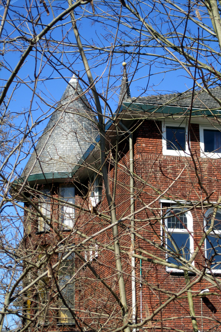 van twee, drie of vier ramen in de gevel zijn geplaatst. De verticale opbouw van de gevel komt tot stand doordat voor ieder niveau een ander type venster is toegepast. De risalerende ingangspartij heeft een breedte van zes vensterassen. Bereikbaar door middel van enkele treden, bevindt zich in het midden van de risaliet een naar binnen toe getrapt, spitsboogvormige portiek. De in rollagen uitgevoerde spitsboog is geplaatst op een hoge natuurstenen plint. De originele spitsboogvormige dubbele deuren zijn nog aanwezig en zijn voorzien van middeleeuws aandoend ijzeren beslag. Rondom bevindt zich een omlijsting van glas. Het ingangsportaal uitgezonderd, is de opbouw van de risaliet hetzelfde als het overige deel van de voorgevel; op de donkere gemetselde plint zijn staande, samengestelde vensters geplaatst bestaande uit een vast onderraam en een vallend bovenraam. De vensters op de verdieping zijn uitgevoerd met een halfrond klapraam als bovenlicht. Een gemetselde rollaag scheidt het muurwerk tussen de eerste en tweede verdieping. Hierop is de bovenste reeks vensters geplaatst, met de bovendorpel strak tegen de onderzijde van de daklijst. De kleine, vierkante vensters zijn als draairaam uitgevoerd. In het midden van het dakschild is een lage dakkapel zichtbaar, met twee vensters onder een ver overstekende bakgoot. Linkerzijgevel:In het verlengde van de risaliet aan de voorzijde van het gebouw, ligt de kapel. Deze vleugel is haaks op de hoofdbouw geplaatst en omvat een begane grond, een hoge eerste verdieping waar de ruimte van de kapel zich bevindt, en een tweede verdieping onder de kap. De linkerzijgevel wordt halverwege onderbroken door een uitgemetselde, halfronde traptoren met spits boven een brede goot met overstek. Over alle bouwlagen bevinden zich smalle, staande vensters in stalen kozijnen. Het geveldeel links van de traptoren is vier vensterassen breed en voorzien van gemetselde pilasters. De ruimte van de kapel, die zich op de eerste verdieping bevindt, is voorzien van hoge, staande vensters met stalen kozijnen en een kleine roedenindeling. Op de tweede verdieping is direct onder de overstekende goot een reeks samengestelde vensters geplaatst. De nok van het zadeldak is gesierd met een overhoeks geplaatst vierkant torentje met ingesnoerde, verspringende spits. | 2 |