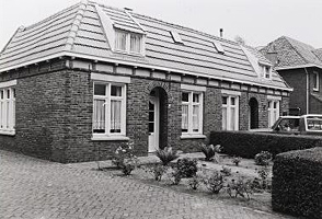 Baksteen, betonlateien. Meerdelige ramen. Rondboogportiek. Afgeplat schilddak. Kroonlijst met gepleisterde velden. Dakkapellen. Muldenpannen.