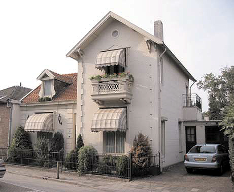 BeschrijvingAlgemeen:Het woonhuis uit 1881 is gelegen op een perceel aan de noordzijde van de weg Hintham, in het oorspronkelijke centrum van het dorp. De kleine tuin voor het huis is voorzien van een Art Deco hekwerk. Het pand heeft een L-vormige grondslag en is met de linkerzijgevel verbonden met het buurpand Hintham 30. De bouwmassa is op te splitsen in twee bouwdelen. Het rechterbouwdeel heeft een rechthoekige grondslag en is met de korte zijde naar de straat gelegen. Dit hoofddeel heeft twee verdiepingen en een zolderniveau. Dwars hierop is, iets verder van de straat af, een eveneens rechthoekige bouwdeel met de voordeur gelegen. Dit dwarsdeel heeft een begane grond en een zolderniveau. Het met Tuile-du-Nord pannengedekte zadeldak van het dwarsdeel sluit met de nok aan, net boven de dakgoot van het met dezelfde pannen gedekte zadeldak van het hoofddeel. Het gehele pand is in een later stadium witgeschilderd. Ter rechterzijde van de rechterzijgevel is een eenlaags aanbouw met plat dak gelegen. Mogelijk betreft het hier een schuur of werkplaats uit de bouwtijd.Voorgevel:De betrekkelijk smalle, witgeschilderde voorgevel van het hoofddeel is met handgevormde bakstenen in kruisverband gemetseld. De gevel is voorzien van hoekkettingen en een middenrisaliet, beide in machinaal gevormde baksteen. Het risaliet, dat niet over de gehele gevelhoogte doorloopt, is geleed met twee boven elkaar gelegen gevelopeningen en wordt aan de bovenzijde afgesloten met een eenvoudig fronton. De gevelopening op de begane grond is voorzien van een T-venster met vast bovenlicht en schuivend onderraam. De eerste verdieping is voorzien van dubbele deuren die toegang geven tot het balkon. Dit houten balkon, met balkonzuilen en daartussen een gesmeed hekwerk, wordt gedragen door twee dubbele consoles (na hat bezoek is het balkon vervangen door eenzelfde smeedijseren hekwerk als het hekwerk langs de voortuin en het andere balkon). Het dakoverstek wordt ter plaatse van de hoekkettingen gedragen door gedecoreerde houten consoles. De gevel van het dwarsdeel is voorzien van een T-venster met aan weerszijden een liseen met blokmotief. De voordeur met getoogd bovenlicht bevindt zich uiterst rechts in de gevel. Het dak is ter hoogte van het venster voorzien van een houten dakkapel met leibedekte zijkanten, een met pannen gedekt zadeldak en een vernieuwd raam. De windveer heeft houtsnijwerk, de wangen zijn later aangebracht. De geprofileerde bakgoot volgt de vorm van het gevelvlak. Door middel van een stucwerk lijst wordt een kroonlijst gesuggereerd. | 1 |
