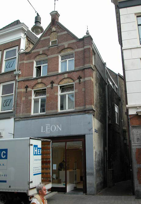 Voorgevel:De voorgevel is een bakstenen topgevel van twee vensterassen breed, in neo-renaissance-stijl uit de late 19de eeuw. Op de begane grond bevindt zich een recente winkelpui met een grote gevelopening en een hardstenen omlijsting. De basementen van de penanten, eveneens van hardsteen, dateren waarschijnlijk van een oude winkelpui uit 1913, en zijn voorzien van decoratieve banden bovenlangs, met een profilering en vierkantjes in reliëf. Boven de pui bestaat de gevel uit rode baksteen in kruisverband met knipvoegen, afgewisseld met kunststenen speklagen. De gevel is gevat tussen hoeklisenen. Net boven de pui is een hardstenen cordonlijst, die ook om de hoeklisenen doorloopt, met direct erboven twee vensters. Deze zijn gevat onder steens segmentbogen met sluitstenen van kunststeen, met in het boogveld siermetselwerk van gele bakstenen die ten dele in andere kleuren zijn geglazuurd. Op kalfhoogte bevinden zich in de dagkanten kunststenen blokken. De kozijnen hebben vellingkanten en bevatten dubbele draairamen onderin en valramen bovenin, die zijn ingevuld met gekleurd glas-in-lood en gebrandschilderde medaillons in het midden. Op de tweede verdieping volgt de gevel het zelfde schema als op de eerste, maar de vensters zijn hier lager, met korfbogen in plaats van segmentbogen, en de hoekblokken op kalfhoogte ontbreken. De vloer van de tweede verdieping wordt in de gevel gemarkeerd door drie smeedijzeren sierankers met krulwerk. Boven de tweede verdieping begint de ingesnoerde topgevel. Op de hoeklisenen liggen vlakke geprofileerde platen van hardsteen, die overgaan in de hardstenen gevellijst. Op de rechter hoekliseen staat nog een hardstenen bol, bekroond door een smeedijzeren pijl. Hoogstwaarschijnlijk stond van oorsprong ook zo'n bol met pijl op de linker hoekliseen, maar deze is verdwenen. In de topgevel, die een stuk boven de nok van het dak uitsteekt, is er centraal een rondboognis met een hardstenen lekdorpel, onderin een klein vierkant raampje en daarboven een vulling van gele baksteen. De boog heeft een zandstenen sluitsteen met in reliëf een lachende kop die een vlak met een geprofileerde lijst draagt, waarboven een uitgemetselde bakstenen toppinakel staat. Deze wordt bekroond door een zandstenen fronton met profileringen en bovenop een standaard met een smeedijzeren windvaan voorzien van decoratieve krullen. De zandstenen sluitsteen en het fronton zijn waarschijnlijk van oudere datum dan de rest van de voorgevel. Mogelijk zijn ze 17de-eeuws en zijn het hergebruikte onderdelen van een oudere gevel. Op de toppinakel is een sieranker bevestigd. | 3 |