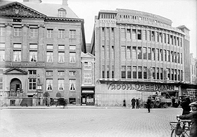 In het midden cafe De Schietspijp met daarnaast gedeeltelijk het stadhuis op de Markt en het nieuwgebouwde filiaal van Vroom & Dreesmann nog achter de schutting gezien vanaf de hoek Markt / Pensmarkt.