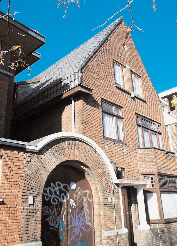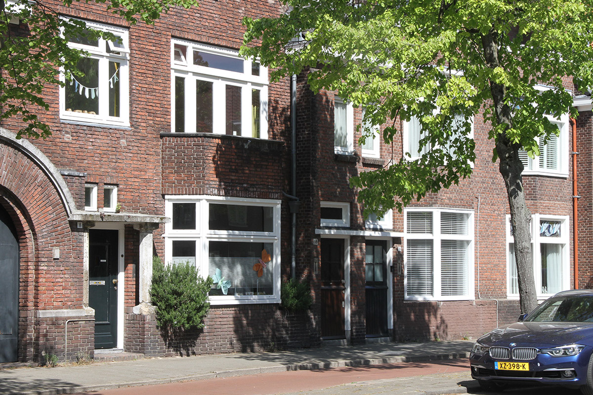 BeschrijvingAlgemeen:Aan de noordelijke zijde van de Jan Schöfferlaan bevindt zich een pand uit 1931 dat één geheel vormt met de naast gelegen school. Het gebouw staat op een rechthoekig diep perceel, met achter op het terrein een bijgebouw en een garage tegen de linkerzijgevel. Het pand met een topgevel naar de straat gericht omvat een begane grond, eerste verdieping en een zolder onder een met geglazuurde verbeterde Hollandse pannen gedekt geknikt zadeldak. De dakvlakken hebben aan de onderzijde drie rijen verticaal geplaatste pannen. Aan de linkerzijde van het pand is tegen de zijgevel een garage aangebouwd die één geheel vormt met de entree van het pand en de voorgevel van het buurpand (nr. 14). Aan de rechterzijde is het buurpand later tegen nummer 16 aangebouwd.Voorgevel:De garage bevat een dubbele deur verdiept in het gevelvlak onder een drie steens zware rondboog. De boog is afgedekt met betonplaat die tevens het dak vormt. De in Vlaams verband gemetselde gevel is voorzien van een plint afgedekt met een natuurstenen rand. De in handvormstenen opgetrokken gevel is voorzien van verdiept liggende voegen. Naast de garage heeft de gevel een met zuilen op bakstenen lage muren geaccentueerde ingangspartij. De betonnen zuilen dragen een betonnen plaat die èèn geheel vormt met het gebogen dak van de garage. De oorspronkelijke voordeur heeft twee smallere bovenlichten en een natuurstenen brievenbus naast de deur. Aan de rechterzijde is een erker uitgebouwd die tevens als balkon dienst doet voor de verdieping. De driezijdige erker heeft grote ruit aan de onderzijde en kleine bovenlichten gevuld met glas in lood. De gevelopeningen zijn voorzien van halfsteens rollagen evenals bij lage muur van de bloembakken aan beide zijden van de erker.Op de verdieping bevinden zich een kozijn meteen vast groot raam en een draairaam met beide kleppende bovenlichten. Het kozijn ter plaatste van het balkon bevat een dubbele deur en twee smalle hoge vensters op borstweringen. De vier delen hebben met glas in lood gevulde bovenlichten. Op de zolder bevat de gevel twee kozijnen met een gespiegelde indeling: een draairaam en een smal en hoog venster met drie ruitvlakken. De kozijnen zijn van elkaar gescheiden door een overhoeks uitgemetselde muurdam. Onder zijn de kozijnen voorzien van een betonnen raamdorpel met een verticaal geplaatst natuurstenen blok, de bovenzijde is voorzien van rollagen en een betonnen blok op de muurdam. | 1 |