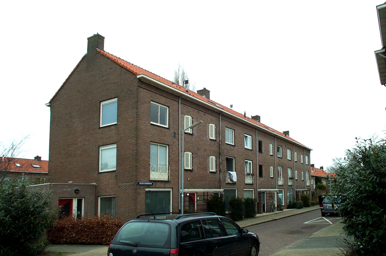 Grote etage- eengezinswoningen met gespiegelde plattegrond, uitgevoerd met een derde bouwlaag en kap. De uitvoering en vormgeving is verder dezelfde als de woningen in deze straat De voordeurpartij is als risaliet van geringe diepte uitgebouwd over alle bouwlagen. Tussen de twee voordeuren twee smalle toiletvensters. De gevelwand van de voordeurpartij is voorzien van horizontale metseleffecten door middel van een terugliggende rode steen. Aan de achterzijde is op de tweede bouwlaag een over de gehele lengte doorlopend balkon aangebracht met een balustrade in buisprofiel. Het hogere blok in de Philips de Tweedestraat ligt enkele meters achter de rooilijn. Een blok wordt links en rechts afgesloten met een venstertravee waardoor het patroon 1-2-2-2-2-2-1 ontstaat. De blokken zijn voorzien van zadeldaken met geringe overstek, gedekt met rode en grauwe pannen van het type 'Hollands verbeterd'. Voor de woningen liggen klinkerstroken en een smal perk. Op het dak aan de achterzijde bevinden zich dakkapellen. Onder de goot van de achtergevel is een architraaf uitgevoerd in siermetselwerk. Aan de zijde van de evennummers aan de Maximiliaanstraat en de Philips de Schonestraat staan 5 garageboxen. Bij het blok aan de Philips de Schonestraat 12-26 loopt de risaliet over twee bouwlagen.