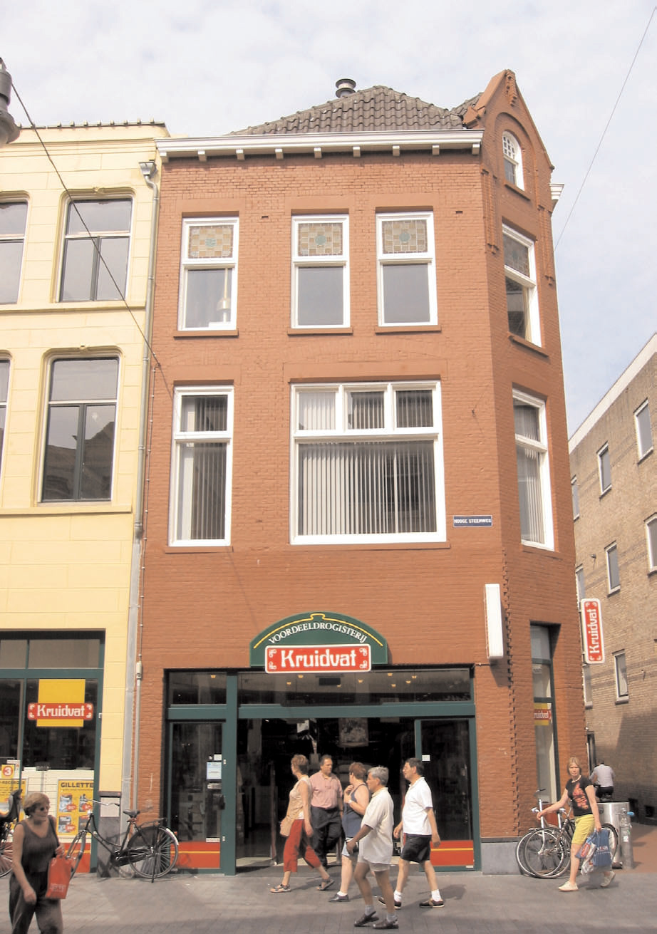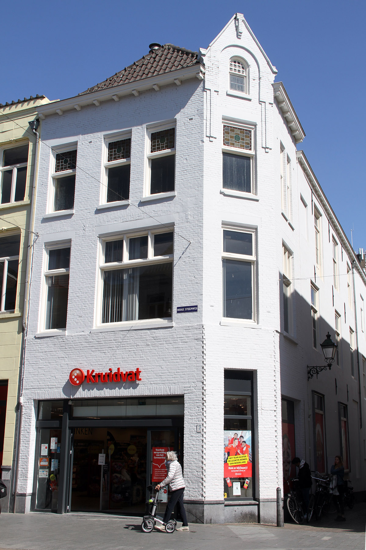 BeschrijvingAlgemeen:Het pand Hooge Steenweg 1 is een vijflaags, rechthoekig bouwlichaam dat gelegen is op de hoek van de Hooge Steenweg en de Scheidingstraat. Het pand heeft een lange bouwgeschiedenis die teruggaat tot het begin van de veertiende eeuw en is in oorsprong een zaalhuis dat in de zestiende eeuw is opgedeeld in een vast voor- en achterhuis). Het perceel maakt deel uit van de oudste verkaveling van de stad 's-Hertogenbosch, wat het aannemelijk maakt dat het pand een houten voorganger heeft gehad. Het huidige pand is in 1854 ten behoeve van de verbreding van de Scheidingstraat versmald, hierdoor liggen de kelders gedeeltelijk buiten het pand, onder de straat. Net na 1900 is het gehele pand voorzien van een nieuwe voorgevel met afschuining en een nieuwe rechterzijgevel. Het huidige schilddak, dat met gesmoorde verbeterde Hollandse pannen is gedekt, is in vermoedelijk ten tijde van de vernieuwing van de voorgevel aangebracht. Het pand is voorzien van drie kelders. Een voorkelder onder de Hooge Steenweg is in 1971 gesloopt. Het pand bevatte in de vroege veertiende eeuw een kelder voorzien van een houten balklaag. In de zestiende eeuw is een opsplitsing ontstaan waarbij deze kelder in de lengterichting is opgesplitst en voorzien van een tongewelf. De achterkelder heeft een vlak tongewelf dat vermoedelijk uit de veertiende eeuw stamt. Na de versmalling van het pand in 1854 vallen de kelders deels buiten het pand. In het voorhuis van Hooge Steenweg 1 zijn in de huidige verdiepingsbalklaag zware moerbalken met pengaten van korbelen hergebruikt. Deze balken zijn een restant van de vroeg veertiendeeeuwse constructie (dendrochronologische datering 1304). De balklagen van de eersteverdiepingsbalklaag in het achterhuis (ingekort tijdens de versmalling in 1854) zijn in de winter van 1482/1483 gedateerd. De balken zijn voorzien van pengaten die duiden op een houtskelet-constructie en een rankenschildering die in de zeventiende eeuw is overschilderd.Voorgevel:De in kruisverband gemetselde, vroeg twintigsteeeuwse voorgevel - een lijstgevel - is met roodbruine verf beschilderd. De begane grond heeft een moderne winkelpui, de eerste verdieping een brede en een smalle vensteropening en de tweede verdieping drie gelijkvormige vensteropeningen. De openingen op de eerste verdieping hebben een betonnen latei waarboven een segmentboog, de openingen op de tweede verdieping hebben een identieke latei-constructie met daarboven een halfsteens rollaag. De kozijnen zijn geprofileerd en hebben een schuivend onderraam met een vast bovenlicht dat op de tweede verdieping is uitgevoerd met glas-in-lood. Het brede venster op de eerste verdieping heeft | 1 |