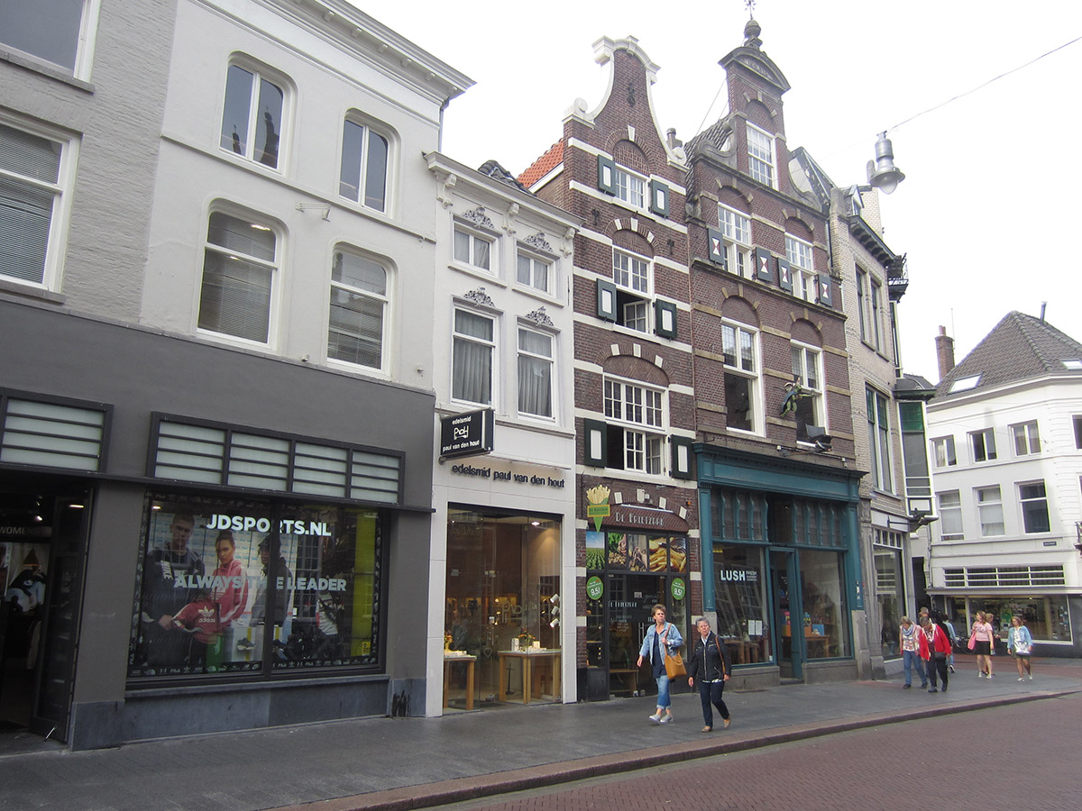 De gepleisterde 19de eeuwse lijstgevel is in de 20ste eeuw voorzien van een nieuwe winkelpui. Boven de waterlijst, waarin de onderdorpels zijn opgenomen, bevat de eerste verdieping twee vensters, die bestaan uit ongedeelde schuiframen met een vast bovenlicht. Op de tweede verdieping bevinden zich twee vensters, bestaande uit twee-ruits draairamen. Rechts naast het rechterraam bevindt zich een gevelanker. Alle vensters zijn voorzien van een stucomlijsting, waarin aan de bovenzijde een rijk gedecoreerde kuif is aangebracht. De gevel wordt beëindigd door kroonlijst op consoles die is afgekapt aan de rechter zijde.