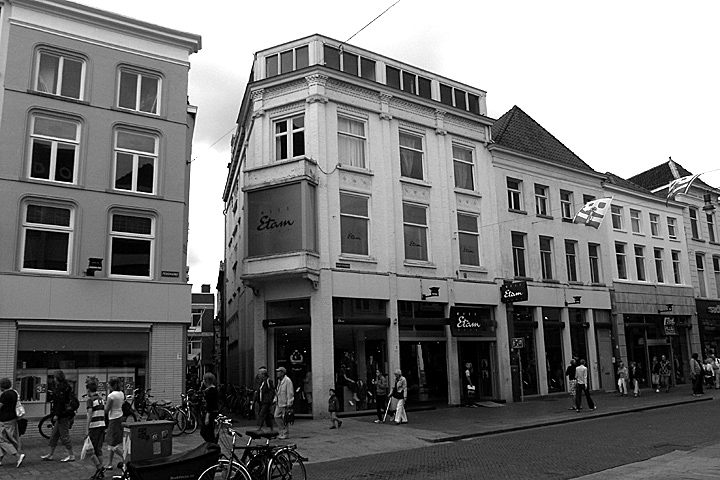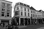 Mooie namen droegen de panden in de zestiende eeuw: In den Pellicaan, op de hoek van de Hoge Steenweg en het Tweede Korenstraatje en ernaast lag: De Gulden Voetboghe. De namen zijn verdwenen en de huizen zelf ook. Latere verbouwingen tonen heel andere panden dan de oorspronkelijke. Vandaag een kijkje achter de voorgevel van Hoge Steenweg 2-4. In de negentiende eeuw waren het twee naast elkaar staande huizen aan de Hoge Steenweg. Wie de karakteristieke voorgevel heeft laten bouwen of verbouwen is niet bekend: pas vanaf de twintigste eeuw heeft het stadbestuur daar bemoeienis mee. Waarschijnlijk is dat Laurentius van Geffen geweest die het op 11 oktober 1836 van de gezusters Vissers koopt. De familie was vijfenvijftig jaar eigenaar van de twee panden geweest. Van Geffen, oorspronkelijk fabrikant van hoeden en petten, en zijn jonge vrouw Adriana van der Weegen, een mutsenmaakster, waren uit Tilburg afkomstig. In 1846 sterft Adriana in het kraambed. Zoals in die tijd wel meer gebruikelijk was, kwam een dertigjarig ongehuwd schoonzusje van Van Geffen, een zusje van de overledene, in het huis wonen om het gezin te verzorgen. Maar tot een huwelijk tussen hen beiden is het niet gekomen! De zaak verandert kennelijk van negotie, want in het midden van de negentiende eeuw adverteert de firma Van der Geffen Van der Weegen als een 'Magazijn van manufacturen, lakens en modestoffen'. Tevens vervaardigen zij matrassen. Maar ook adverteren zij in het Frans met kleding. 'Confection sur messure pour hommes et enfants'. Een tweede generatie zette de zaak vanaf 1870 voort, maar na de dood in 1894 van Felix-Franciscus van Geffen zette weliswaar diens weduwe de winkel een tijdje voort, maar de derde generatie kwam niet aan het roer te staan. In het begin van de twintigste eeuw werden de twee panden verkocht. In het hoekpand - de Pelikaan - kwam een café en ernaast de Gouden Voetboog, een winkel. In 1920 waren de gebroeders Ubink eigenaar van beide panden geworden. Zij lieten architect H.J.C. de Haan een ontwerp maken voor een nieuwe, grote zaak en de negentiende eeuwse gevels verdwenen. Het is de voorgevel die aan de bovenzijde nu nog duidelijk te herkennen is. Ubink, handelend onder de naam De Kroon, verkocht er eveneens manufacturen, bedden en tapijten. Lang bleef de naam Ubink eraan gehecht. In 1967 komt er een fusie tot stand met de firma Bisschof. Nu komen er twee aparte winkels: een dames- en herenmodezaak aan de Hoge Steenweg en een winkel in interieurverzorging aan het Burg. Loeffplein. Aangezien de ontwikkelingen rond dit plein niet in de lijn der verwachting liepen, werd de laatste winkel weer gesloten. Maar een modezaak bleef aan de Hoge Steenweg. Na acht jaar Bisschof werd het in 1975: Modehuis Lampe. Nu: Miss Etam. |