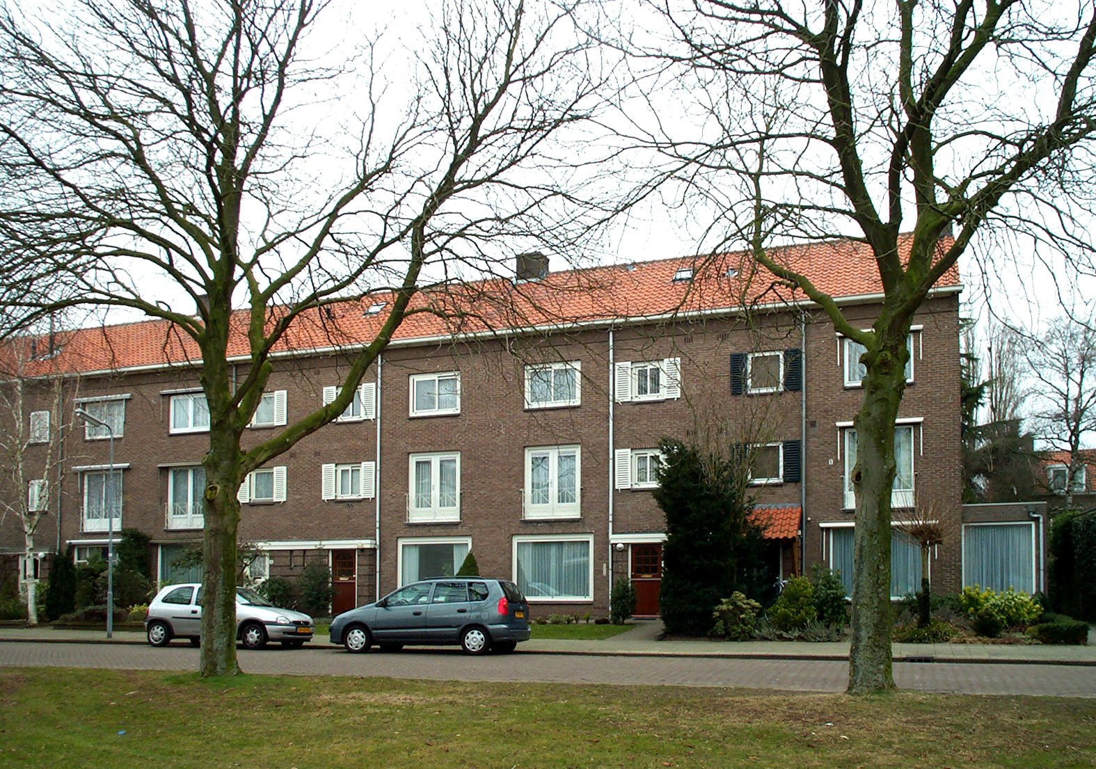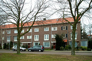 Grote etage- eengezinswoningen met gespiegelde plattegrond, uitgevoerd met een derde bouwlaag en kap. De uitvoering en vormgeving is verder dezelfde als de woningen in deze straat. De voordeurpartij is als risaliet van geringe diepte uitgebouwd over alle bouwlagen. Tussen de twee voordeuren twee smalle toiletvensters. De gevelwand van de voordeurpartij is voorzien van horizontale metseleffecten door middel van een terugliggende rode steen. Aan de achterzijde is op de tweede bouwlaag een over de gehele lengte doorlopend balkon aangebracht met een balustrade in buisprofiel. Het hogere blok in de Philips de Tweedestraat ligt enkele meters achter de rooilijn. Een blok wordt links en rechts afgesloten met een venstertravee waardoor het patroon 1-2-2-2-2-2-1 ontstaat. De blokken zijn voorzien van zadeldaken met geringe overstek, gedekt met rode en grauwe pannen van het type 'Hollands verbeterd'. Voor de woningen liggen klinkerstroken en een smal perk. Op het dak aan de achterzijde bevinden zich dakkapellen. Onder de goot van de achtergevel is een architraaf uitgevoerd in siermetselwerk. Aan de zijde van de evennummers aan de Maximiliaanstraat en de Philips de Schonestraat staan 5 garageboxen. Bij het blok aan de Philips de Schonestraat 12-26 loopt de risaliet over twee bouwlagen.