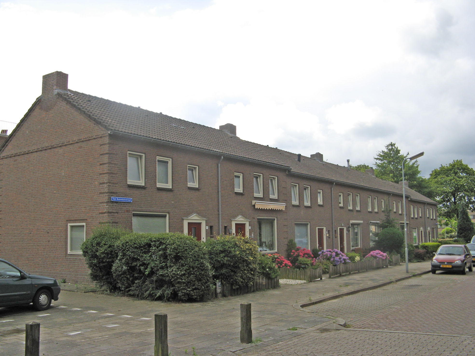 Gesloten rij van 9 eengezinswoningen. Begane grond en 1e bouwlaag. Zadeldak gedekt met verbeterde Hollandse pannen. Elke woning bestaat uit twee traveeën. Eerste travee met voordeur, tweede travee met groot venster op de begane grond. In de eerste bouwlaag wijken de borstweringen van de hoekpanden af van de andere woningen. Hier is in de eerste travee een samengesteld venster geplaatst met daaronder een in visgraat gemetselde borstwering.