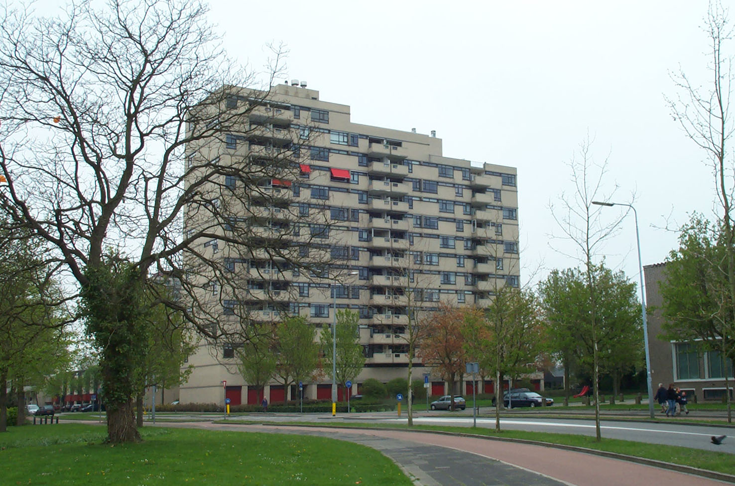 Hoogbouw in 15 bouwlagen. De eerste bouwlaag/beganegrond is ingericht met twee entree hallen en met ruimten voor bergingen en garages. De bovenste bouwlaag is bestemd als pent-house. Het complex bestaat uit een gewapend betonskelet met systeemgevelplaten en dito balkons, voorzien van een bakstenen klamp, uitgevoerd in schoonmetselwerk in licht- rode baksteen. De zichtbare cordonlijsten geven het gebouw een duidelijke geleding.
