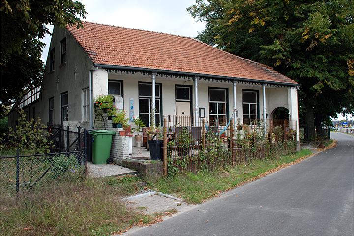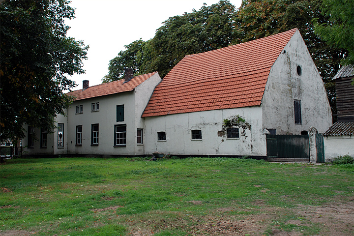 gesitueerd, met een niet-oorspronkelijke deur en een enkelruits (= zonder roedenverdeling) bovenlicht. Aan weerskanten van de ingang bevinden zich telkens twee vensters met een (schuif-)raam met 4-ruits roedenverdeling en een enkelruits bovenlicht. Zijgevels:Langs de rechter zijde (oostkant) heeft het voorste bouwdeel enkele vensters als aan de voorkant, alsmede hierboven liggende lage zoldervensters (‘mezzanino’).Het middelste bouwdeel bevat links eveneens twee vensters met een 4-ruits schuifraam en een daarboven gelegen laag zoldervenster met telkens twee enkelruits raampjes. Rechts is er een venster met een 6-ruits schuifraam. Hierboven is een luikopening gesitueerd. De deel heeft drie getoogde stalvensters met een 6-ruits raam. De linker zijgevel (westkant) van het voorste bouwdeel heeft links twee vensters als aan de voorzijde. Uiterst rechts een langs de gaanderij gelegen venster met een 4-ruits raam. Rijkbewerkte smeedijzeren sierankers markeren de positie van de balklaag. In de op het dak aansluitende topgevel twee vensters met een 4-ruits schuifraam. Langs het middelste bouwdeel bevinden zich enkele vensters en ingangen. Geheel links - langs de deel - vier stalvensters als genoemd. Achtergevel:Aan de achterkant (noordzijde) van de deel zijn er verschillende gevelopeningen, waaronder een hooiluikopening.Ruimtelijke indeling:Er is geen nadere documentatie voorhanden.Constructies:Het gebouw zal zijn voorzien van houten balklagen.Interieurelementen: | 4 |