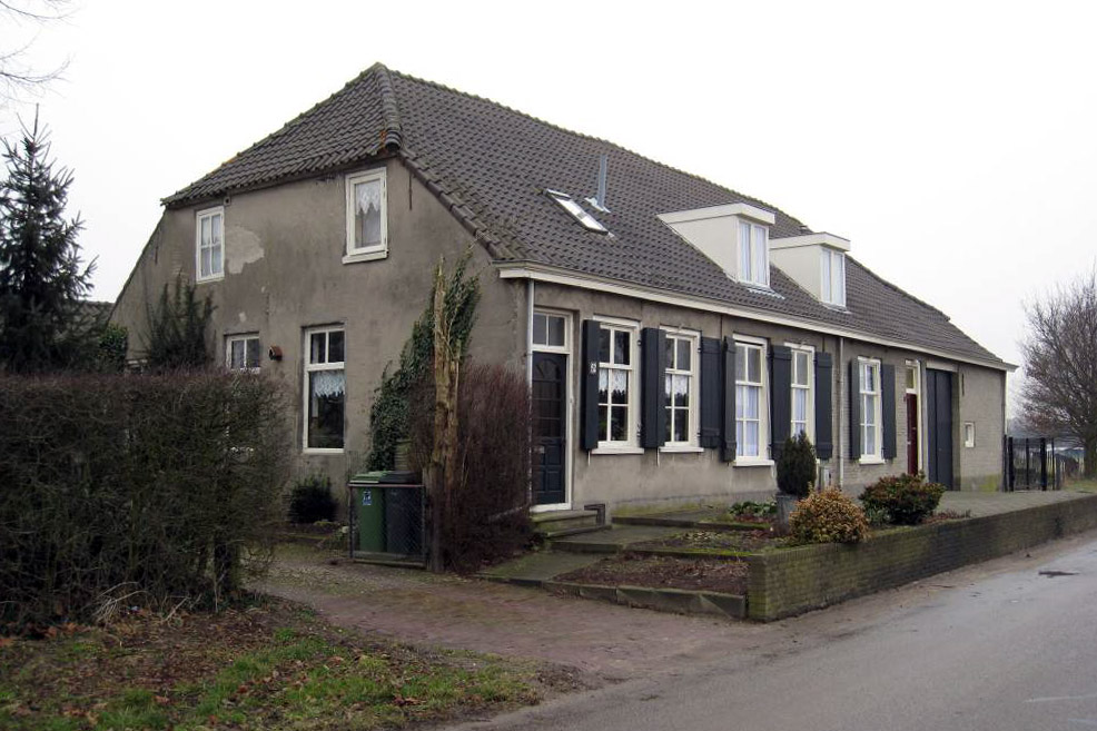 Interieurelementen:Het interieur is niet bezocht. Het interieur is mede beschermd voor zover het monumentale waarden omvat.Erf, bijgebouwen, diversen:Het pand bevindt zich op een bijbehorend terrein met erf en tuin. Rechtsachter staat een schuur. Deze is éénlaags en heeft een zadeldak met gesmoorde muldenpannen. De gevels zijn ook hier in baksteen gemetseld en grijsgeschilderd. Aan de voorkant bevindt zich in het midden een niet oorspronkelijke doorgang met garagedeur. Uiterst links en rechts zijn er vernieuwde ingangen. De diverse ingangen worden afgewisseld door getoogde stalvensters met een 6-ruits ijzeren raampje.Op het terrein bevinden zich nog diverse andere gebouwtjes, waaronder een garage annex berging uit 1983. | 4 |