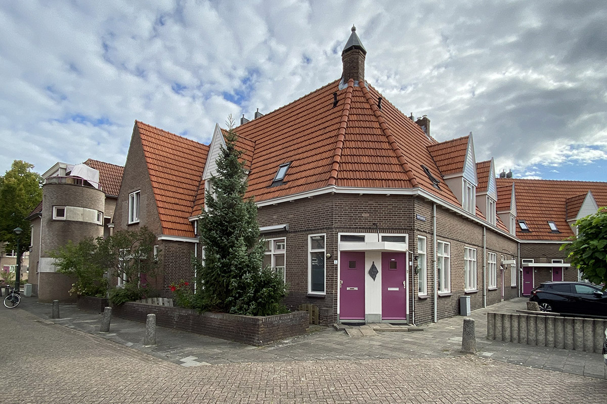 BeschrijvingAlgemeen:Dit woningcomplex bestaat uit een veertiental wooneenheden en is gelegen aan het Rietpolderplein en de Pieter Vreedestraat. Het complex heeft een symmetrisch, U-vormig grondplan en omvat twee niveau’s: begane grond en zolder. Het geheel is voorzien van een met muldenpannen gedekt zadeldak met dakkapellen. Deze dakkapellen hebben eveneens een klein zadeldak dat met muldenpannen gedekt is.Voorgevel:De in staand verband gemetselde voorgevel van het complex heeft een aantal vensteropeningen dat aan de bovenzijde is voorzien van een rollaag en aan de onderzijde van keramische onderdorpels. De gevel heeft een trasraam in donkere stenen dat afgesloten is met een rollaag. In deze rollaag zijn de onderdorpels van de vensters opgenomen. Het bovenliggende, lichtergekleurde muurwerk is boven de vensteropeningen voorzien van een koppenlaag in donkerdere steen. Op begane grondniveau zijn vensters aanwezig met één, twee of drie onderramen, met een evenredig aantal bovenlichten.Al deze vensters zijn vernieuwd en voorzien van dubbel glas. Het muurwerk is aan de bovenzijde afgesloten met een eenvoudige, geprofileerde bakgoot op gootklossen. De voordeuren en de deurkozijnen met bovenlicht zijn vernieuwd. Enkele zijn nog voorzien van de oorspronkelijke neuten en dorpel. Deur en bovenlicht worden gescheiden door een afdak dat door middel van een kwartronde beugel aan het muurwerk verankerd is. De gevel van het complex heeft een aantal accenten. De woningen op de uiterste einden, Pieter Vreedestraat 1 en 5, zijn voorzien van een uitgebouwde gevel met top en hebben een lagere nokhoogte. De daklijn van deze gevels heeft een aantal vlechtingen met daarop twee lagen metselwerk. Het huidige venster in de top van de gevel, zit op de plaats waar afgaande op de bouwsporen oorspronkelijk twee kleinere vensters gepositioneerd waren. De nok van het zadeldak ligt enigszins lager, één van de dakschilden steekt aan de onderzijde door. Het midden van het complex is geaccentueerd met een bijzondere entree als een soort torentje, behorende bij de adressen Rietpolderplein 5 en 6. Het muurwerk is doorgezet op zolderniveau en wordt daar afgesloten met een driezijdige kap, voorzien van een acht-hoekige gemetstelde schoorsteen. Een dergelijke schoorsteen bevindt zich ook op de hoeken van het complex. Het zolderniveau is aan weerszijden van dit muurwerk voorzien van een eenvoudige dakkapel onder plat dak. Linkerzijgevel:De linkerzijgevel, behorende bij Pieter Vreedestraat 7, heeft twee vensters onder een rollaag. Vermoedelijk is de gehele zijgevel vernieuwd. De gevel is in Vlaams verband gemetseld en afgesloten met een eenvoudige geprofileerde bakgoot. Ter linkerzijde bevindt zich een lage aanbouw onder een met pannen gedekt dak (vermoedelijk een zadeldak) met flauwe dakhelling. De goot is identiek aan de goot van het bouwdeel aan de straatzijde.Rechterzijgevel:De rechterzijgevel, behorende bij Pieter Vreede- | 1 |
