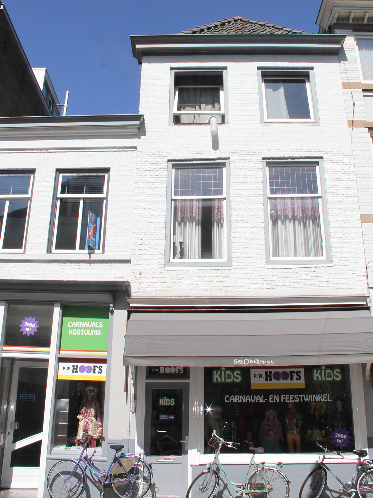 Zijgevels:Het pand wordt aan beide zijden begrensd door bebouwing. Enkel het bovenste deel is zichtbaar en bestaat uit schoon metselwerk (ca. 1970).Achtergevel:Op foto’s uit 1994 is de achtergevel van het achterhuis als volgt zichtbaar: Een in schoon metselwerk uitgevoerde puntgevel met op de verdieping twee vensters met draairamen en glas-in-lood bovenlicht en op de zolder een venster met draairamen. Boven al deze vensters een rollaag.Ruimtelijke indeling:Over de indeling van het pand wordt in een rapport uit 1994 het volgende gezegd:Inwendig heeft de verdiepingsbalklaag van het voorhuis drie vakken. De laaggelegen verdiepingsbalklaag van het achterhuis (een eventuele vroegere onderkeldering aldaar is onwaarschijnlijk) bestaat uit twee vakken met een stookplaatsraveling tegen de voormalige achtergevel. Latere stookplaatsen bevinden zich tegen de rechterzijmuur. De voormalige achtergevel (aan de binnenkant) heeft aan linkerzijde een oorspronkelijke uitgang naar het overdekte binnenplaatsje, in het midden een latere, brede rondgesloten doorgang. Op de begane grond bevinden zich de winkelruimtes. Op de verdieping zijn twee woningen gerealiseerd, één op de eerste verdieping en één op de tweede verdieping. Hierbij zijn de niveauverschillen tussen het voor- en achterhuis gehandhaafd. Alle trappen in het pand zijn (volgens bouwtekeningen uit 1995) in het voorhuis tegen de brandmuur gesitueerd. Deze brandmuur is op de begane grond grotendeels verdwenen. Constructies:In het opnamerapport uit 1994 is over de constructies het volgende opgenomen:De verdiepingsbalklaag van het voorhuis heeft drie vakken moer- en kinderbalken, waarvan tot dusver kon worden geconstateerd dat de kinderbalken een rode beschildering hebben. De bovenliggende balklagen en kapconstructie zijn recent. De lager gelegen verdiepingsbalklaag van het achterhuis heeft twee vakken moer- en kinderbalken met een stookplaatsraveling tegen de oorspronkelijke achtergevel. De moerbalk is voorzien van een -naderhand afgehakt- peerkraal sleutelstuk (15de of vroeg 16de-eeuws). De balklagen op de verdieping en de kapconstructie zijn van een recente datum. De rechter zijmuur is hoogstwaarschijnlijk gemeenschappelijk met het rechter buurpand. De linker zijmuur is gemeenschappelijk met het linker buurpand nr. 157. Interieurelementen:In het pand zijn nog beschilderde moer- en kinderbalken en peerkraalsleutelstukken aanwezig. Over andere eventuele waardevolle interieuronderdelen is geen documentatie voorhanden.Erf, bijgebouwen, diversen:Achter de overdekte binnenplaats bevindt zich een jongere aanbouw (voormalig los achterhuis, zou in 1939 vernieuwd zijn), tweelaags met plat dak. | 3 |