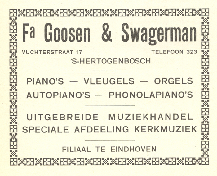 | 1910 | J.A. Boonekamp (filiaalh. v/d fa. Goosen en Swagerman) pianohandel |