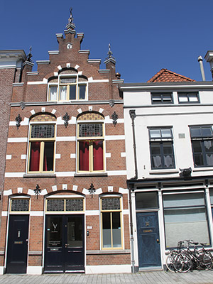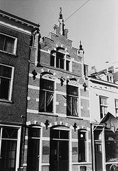 geprofileerde kordonlijst vormt een visuele scheiding tussen de verdieping en de zolder. Het geheel wordt afgesloten door een topgevel met trappen en overhoeks geplaatste top- en hoekpilasters op een gebeeldhouwde kraagsteen. Deze pilasters worden op hun beurt weer bekroond door een smeedijzeren sierelement. Als deze genoemde elementen samen geven de gevel een levendige uitstraling. Zijgevels:Het pand wordt aan beide zijden begrensd door bebouwing.Achtergevel:De achtergevel is niet zichtbaar vanuit de openbare ruimte.Ruimtelijke indeling:Op luchtfoto’s is goed te zien dat het pand een rechthoekige plattegrond heeft. Tekeningen geven aan dat de begane grond (deels) in gebruik is als winkel. Op de verdieping zijn in 1987 vier appartementen gerealiseerd die via een trap links in het pand bereikbaar zijn. Over de ruimtelijke indeling van het geheel is geen documentatie aangetroffen.Constructies:Uit archief informatie blijkt dat er zich in het pand een enkelvoudige eerste verdiepingsbalklaag en een enkelvoudige zolderbalklaag bevinden. De kap heeft grenen schaarspanten.Over de zijmuren is geen documentatie voorhanden. Waarschijnlijk heeft het pand gemeenschappelijke (oude) zijmuren met de buurpanden. Interieurelementen:Aantekeningen afkomstig uit het archief wijzen op de aanwezigheid van diverse waardevolle interieurelementen. Zo wordt er gesproken over stucplafonds en schouwen (rechts in het pand) van rond 1900. Of er nog meer monumentale interieurelementen in het pand aanwezig zijn is niet duidelijk.Erf, bijgebouwen, diversen:Op luchtfoto’s zijn achter het pand nog diverse achterbouwen zichtbaar. | 3 |