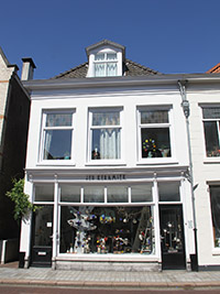 Het pand Vughterstraat 217 is in zijn huidige vorm grotendeels in de 19e eeuw ontstaan. Het stond vroeger bekend onder de historische naam ‘De Swarte Bellaert’. Zoals bij veel panden aan de Vughterstraat het geval is, is ook dit pand het resultaat van een 19e-eeuwse verbouwing van een bestaand ouder pand. De winkelpui is in 1902 grondig gewijzigd. In diezelfde periode is er op het achterterrein een smederij gebouwd. In 1941 is het winkel-woonhuis opnieuw gewijzigd, vooral in het interieur. Het geheel staat geregistreerd als gemeentelijk monument. Als hoekpand gelegen aan het Kater-straatje, heeft het pand Vughterstraat 217 een stedenbouwkundige waarde.Foto: Josephine Peren Dit hoekpand heeft een kelder, begane grond, verdieping en zolder. Het ligt op een rechthoekige plattegrond, het heeft rechts (naar de achtergevel gezien, links) een smalle, tweelaagse aanbouw met een plat dak. Het huis is gedekt met een zadeldak met gesmoorde Hollandse pannen. Aan de voorzijde is een schild met dakkapel. De drie vensterassen brede voorgevel is gepleisterd. De indeling van de pui is (van links naar rechts) als volgt: ingang tot de woning op de verdieping, etalagevenster met 4-ruits bovenlicht en winkelingang. De kozijnen van deze gevelopeningen dateren uit 1902. Het etalageraam is nieuw, net als de deur van de winkelingang. De winkelpui heeft fraaie details, zoals: de profilering in de houten pilasterverdeling tussen de ingangen en het etalagevenster, een hardstenen plint en een houten kroonlijst op consoles. De verdieping heeft drie vensters met hardstenen lekdorpel en een bovenlicht met glas-in-lood. De gevel wordt afgesloten door een gestuukte fries en een houten kroonlijst. In het dakschild aan de voorzijde is een dakkapel opgenomen. De begane grond is in zijn geheel in gebruik als winkel. Tegen de linker zijmuur bevindt zich een rookkanaal (1941), tegen de rechter zijmuur is de opgang naar de bovenwoning. De aanbouw op de begane grond is in gebruik als kantoor. Op de verdieping zijn links de grotere woonvertrekken, rechts is de trap naar de zolder. In de woonvertrekken zijn tegen de linker zijmuur schouwen geplaatst (1941). Ook op de zolder zijn woonvertrekken gemaakt. De kelder heeft een tongewelf. De balklagen zijn enkelvoudig. De kapconstructie bestaat uit gordingen en sporen. |