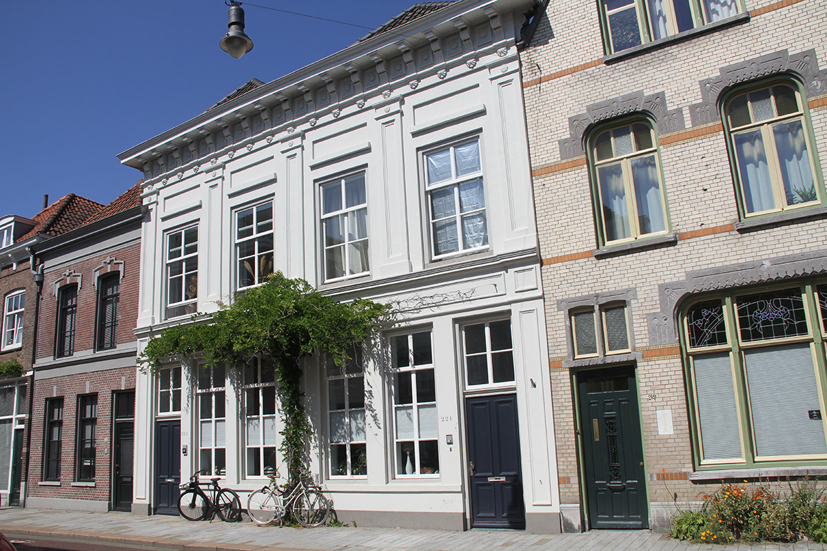 Context(Bouw)historie:Het pand Vughterstraat 221 is in zijn huidige toestand het resultaat van een restauratie in 1987. Tijdens deze restauratie is de begane grond van de voorgevel gewijzigd en in een historiserende trant uitgevoerd. Achter één lijstgevel gaan twee panden (met een oudere, waarschijnlijk 16de-eeuwse kern) schuil. Dit is in het exterieur nog zichtbaar in de dubbele kap en de twee achtergevels.Waarschijnlijk zijn de twee panden al in het begin van de 19de eeuw samengevoegd. Het rechter pand stond in de 16de eeuw bekend onder de historische naam “Het Landwijf” en het linker als “De Lijndeboom”. Vóór deze restauratie in 1987 zijn de panden diverse malen verbouwd. De begane grond is tegenwoordig geheel in gebruik als winkel en op de verdieping zijn appartementen gerealiseerd.Het object is in 1990 geïnventariseerd tijdens het MIP. Ligging:Het pand is gelegen op een (a.g.v. de samenvoeging) relatief breed perceel aan de noordelijke kant van de Vughterstraat, buiten de tweede stadsmuur uit de 14de eeuw. Dit (dubbele) perceel grenst aan de achterzijde van de Westwal. Het geheel is onderdeel van een gevelwand met voornamelijk 19de-eeuwse gevels.Door de eeuwen heen is de Vughterstraat, die in opzet een stadsuitbreiding uit de 14de eeuw is en vanuit het zuiden van ’s- Hertogenbosch naar de Markt loopt, een belangrijke uitvalsweg geweest met grote economische activiteiten. Hierdoor is de hoofdbebouwing aan deze straat door de tijd heen sterk gewijzigd en vernieuwd. BeschrijvingAlgemeen (hoofdvorm, kap):Het object bestaat uit twee bouwlagen en een zolder op een rechthoekige plattegrond. De twee schilddaken met nok haaks op de voorgevel zijn gedekt met gesmoorde Oud Hollandse pannen. De gemetselde voorgevel is voorzien van pleisterwerk en een geschilderde plint.Voorgevel:De vier vensterassen brede voorgevel is geheel gepleisterd. Op de begane grond zijn uiterst links en rechts de toegangen gesitueerd. Deze toegangen zijn, net als de raamkozijnen met 8-ruits schuiframen op de begane grond, tijdens de restauratie in 1987 vernieuwd. Op de verdieping zijn vier 6-ruits schuiframen zichtbaar tussen pilasters met velden. Boven de ramen zijn gepleisterde velden aangebracht. De kozijnen van deze vensters bevatten toognagels en een stenen lekdorpel. De ramen van deze vensters zijn vernieuwd. Een geprofileerde kordonlijst vormt visueel de scheiding tussen de begane grond en de verdieping.De gevel wordt afgesloten door een hoofdgestel met een architraaf, fries met consoles, trigliefen en metopen en een kroonlijst. Zijgevels:Het pand wordt aan beide zijden begrensd door bebouwing.Achtergevel:Vanaf de achterzijde van de Westwal zijn de achtergevels van deze twee samengevoegde panden zichtbaar. Beide panden hebben op | 2 |