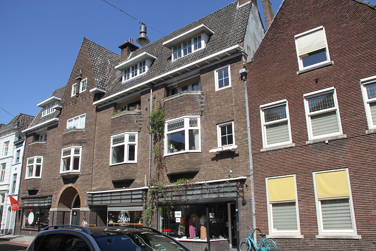 Zijgevels:Het bouwdeel wordt aan beide zijden begrensd door bebouwing. Zowel links als rechts steekt het boven de belendende bebouwing uit. Voor zover zichtbaar zijn beide topgevels blind uitgevoerd en gepleisterd.Achtergevel:Door deze aanbouwen is de eigenlijke achtergevel uit 1931 niet goed zichtbaar. Duidelijk is dat de achtergevel, net als de voorgevel, is opgetrokken in baksteen en ter plaatse van nr. 99 een topgevel heeft.Ruimtelijke indeling:Aan de hand van de documentatie kan er over de ruimtelijke indeling van de panden het volgende gezegd worden. Pand nr. 95: De twee kelders hebben beide een tongewelf en de toegang zit in de achtergevel aan de open plaats. De begane grond is geheel in gebruik als winkel. Tegen de rechter zijmuur ligt de trap naar de eerste verdieping. Hier achter ligt op de eerste verdieping de bordestrap naar de tweede verdieping. Rond dit trappenhuis zijn de woonvertrekken gesitueerd. Het voorhuis heeft een rookkanaal tegen de rechter zijmuur, het achterhuis tegen de linker zijmuur.Pand nr. 97: Bouwsporen tonen aan dat dit pand een verdeling had in voorhuis en vast achterhuis. Zowel het voor- als achterhuis is onderkeldert. De kelder onder het achterhuis is toegankelijk vanaf de kleine binnenplaats en heeft een plafond met hergebruikte eiken balken. In de brandmuur zitten twee doorgangen waarvan er één is dichtgezet. Ook in de rechter zijmuur zit een dichtgezette doorgang. Achter deze zijmuur is op ca. 50 cm een oudere muur aangetroffen, mogelijk behorend bij een oudere kelder. Rechts naast de kelder loopt een gang die zich doorzet in het voorhuis. De kelder onder het voorhuis is waarschijnlijk in 1931 dichtgestort en heeft een tongewelf haaks op de voorgevel. Ook de begane grond van 97 is geheel in gebruik als winkel. Het gebouwtje achter het (voormalige) binnenplaatsje huisvestte vroeger een keuken, maar hoort nu bij de clubruimte op de begane grond van nr. 99. De trappen naar de eerste en tweede verdieping liggen tegen de linker zijmuur. In deze zijmuur is op de eerste verdieping een doorgang gemaakt naar nr. 99. Rond het trappenhuis zijn de woonvertrekken gesitueerd. In 1977 zijn de verdiepingen van nr. 97 samen met de verdiepingen van nr. 99 tot appartementen verbouwd. Pand nr. 99: De begane grond van dit pand is geheel in gebruik als nachtclub. Deze ruimte is oorspronkelijk gebouwd als opslagruimte voor de achter het pand gelegen bottelarij. De trappen bevinden zich tegen de rechter zijmuur. Pand nr. 101: Dit pand is over de Dieze gebouwd en heeft dus geen kelder. De gehele begane grond is tegenwoordig in gebruik als winkel. De trappen zijn tegen de rechter zijmuur gesitueerd. Op de verdiepingen zijn woonvertrekken. | 4 |