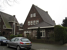 is voor bovengenoemde schoorsteen. Verder bevat de gevel zowel links van de ingang als rechts nog enkele kleine vensters. Achtergevel:De achtergevel is niet zichtbaar vanuit de openbare ruimte.Ruimtelijke indeling:Blijkens de bouwtekeningen heeft de woning een op de hoofdingang aansluitende hall, met langs de voorgevel een herenkamer en een woonkamer. De eetkamer werd langs de rechter zijgevel gesitueerd en langs de achtergevel kwamen het dienstgedeelte en een pantry. Diverse op de verdieping en de vliering gesitueerde slaapkamers.Constructies:Kelder in gewapend beton. Houten balklagen. Enkele ijzeren balken.Interieurelementen:Het interieur is niet bezocht. Het interieur is mede beschermd voor zover het monumentale waarden omvat.Erf, bijgebouwen, diversen:Langs de voortuin bevindt zich een in handvormsteen gemetseld tuinmuurtje met rollaag. Verder is er links een niet oorspronkelijk dubbel draaihek. | 4 |