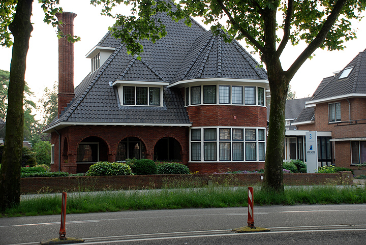 gewoond. Hiernaar verwijst nog altijd het glas-in-lood in het trappenhuisvenster dat de verschillende activiteiten van zijn bedrijf verbeeldt. K.C. Suyling leverde in de eerste helft van de 20ste eeuw een groot aantal ontwerpen in verschillende stijlvormen. Bekend is onder meer het imposante eerste hoofdkantoor van de vroegere PNEM aan de Koningsweg 66 uit 1921. Dit gebouw toont de invloed van het Rationalisme maar is ook verwant aan de vernieuwend-klassieke vormentaal van K.P.C. de Bazel. Ook de in Amsterdamse Schooltrant vormgegeven Beekmanschool aan de Van der Does de Willeboissingel is door Suyling ontworpen (1927). Een ander voorbeeld is het voormalige kantoor van de Nederlandse Bank op de hoek van de Gasselstraat (1912-1913) dat hij in een neo-historiserende trant uitvoerde. In een mengstijl van traditionele en rationalistische motieven zijn de verschillende herenhuizen die Suyling in de vroege 20ste eeuw aan het Julianaplein en de nabijgelegen Stationsweg bouwde. Het onderhavige bouwwerk laat zien hoezeer Suyling aansloot bij de landelijke ontwikkelingen op het gebied van de vernieuwende villa- en landhuisbouw. Al vanaf de vroege 20ste eeuw manifesteerden zich ook in Nederland de op Engelse en Duitse voorbeelden gebaseerde ideeën die onder meer hun weerslag vonden in Hermann Muthesius’ toonaangevende Das Englische Haus uit 1904-1905. Kenmerken als een gevarieerd opgezette, schilderachtige bouwmassa met een vrij hoge kap, ‘Engelse schoorstenen’, en een ruime hall met trappenhuis zijn ook bij het onderhavige pand te zien. Eén van de twee Engelse schoorstenen is hier zelfs opgezet als onderdeel van een zogeheten cosy-corner ofwel de ‘gerieflijke haardzit’ die in de langs de loggia gelegen huiskamer werd gerealiseerd. Modern-efficiënt is de indeling van het huis, met onder meer een naast de eetkamer gelegen service of dienkamer welke in verbinding stond met het keuken- of dienstgedeelte. Een opmerkelijk detail is de fraai gesmede lantaarnarmatuur tegen de voorgevel, met daarin een drakenmotief. Omdat bouwheer Aarts eerder aan het Julianaplein 9 woonde is het aantrekkelijk om dit object toe te schrijven aan de bekende smid C. Teulings die even verderop aan het Julianaplein 17 zijn woonhuis (met smederij) had en waar tegen de gevel eveneens een gesmede lantaarnarmatuur is te zien. Het drakenmotief zal verwijzen naar de bekende ‘gouden’ tegenhanger bij het station. In de loop van de tijd verloor Vughterweg 3 zijn oorspronkelijke functie en is het pand als kantoorvilla in gebruik genomen. In 1985 werd het object samengevoegd met de naastgelegen villa aan de Willem van Oranjelaan 2. Dit gebeurde in opdracht van het accountantskantoor Klynveld Kraayenhof en Co. Het architektenburo Mens & Pruyn uit Vught deed de verbouwing. Blijkens de bij de bouw van het pand gevoerde correspondentie bestond de dakdekking oorspronkelijk uit blauwe leipannen. Tegenwoordig heeft de villa pannendekking. Vermoedelijk was het nu grijsgeschilderde houtwerk aan de binnenzijde van het pand van oorsprong in een bruingebeitste kleurstelling uitgevoerd. Ligging:De villa ligt vrijstaand aan de westzijde van de tegenwoordig als een drukke verkeersweg fungerende Vughterweg. Hier maakt het object deel uit van een reeks in een rechte | 3 |