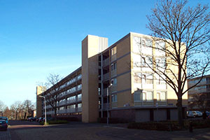 Galerijflats met onderbouw in betonskeletbouw met gevelpuien en prefab gevelplaten met baksteenklamp.