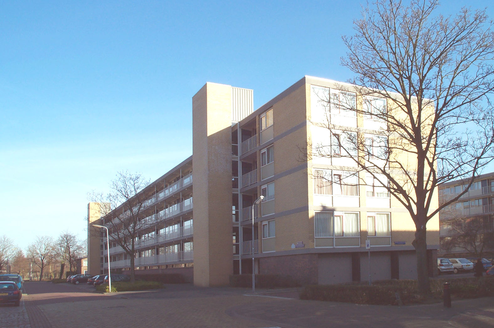 Aan de achterzijde van de woningen is een travee ingericht met inpandige balkons. De bouwblokken zijn voorzien van platte daken waarboven de liftkokers aan de voorgevelzijde uitsteken. Tussen de galerijflats is een open ruimte met paden en gazons voorzien met bomen, zonder afsluiting door andere bebouwing, zodat kan worden gesproken van ´open bebouwing´.